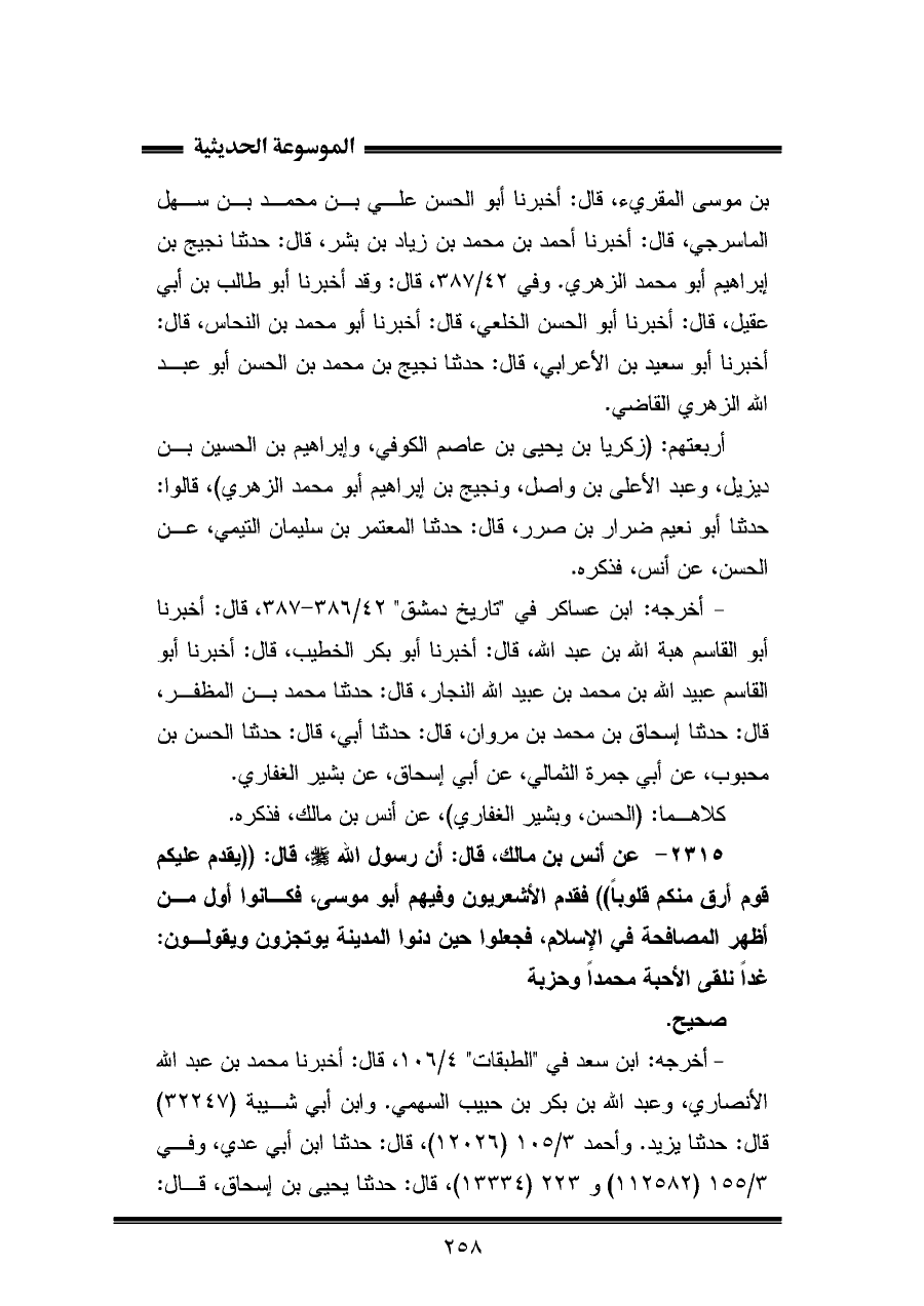 ٢٣١٥ - عن أنس بن مالك، قال: أن رسول الله - صلى الله عليه وسلم -، قال: "يقدم عليكم قوم أرق منكم قلوبًا" فقدم الأشعريون وفيهم أبو موسى، فكانوا أول من أظهر المصافحة في الإسلام، فجعلوا حين دنوا المدينة يرتجزون ويقولون: