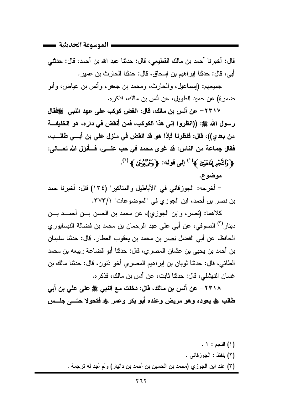 ٢٣١٧ - عن أنس بن مالك، قال: انقض كوكب على عهد النبي - صلى الله عليه وسلم - فقال رسول الله - صلى الله عليه وسلم -: "انظروا إلى هذا الكوكب، فمن أنقض في داره، هو الخليفة من بعدي"، قال: فنظرنا فإذا هو قد انقض في منزل علي بن أبي طالب، فقال جماعة من الناس: قد غوى محمد في حب علي، فأنزل الله تعالى: {وَالنَّجْمِ إِذَا هَوَى} (¬١) إلى قوله: {وَحْيٌ يُوحَى} (¬٢).