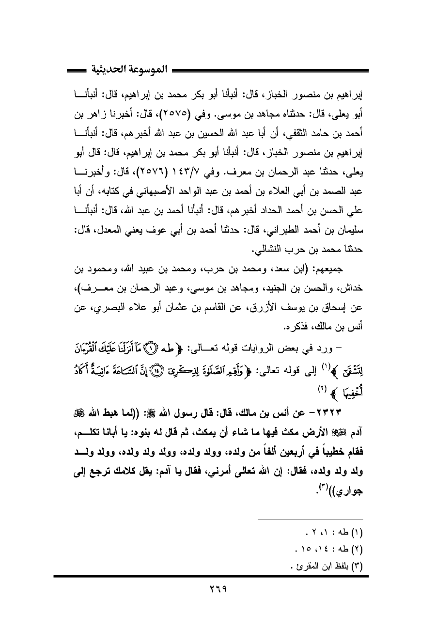 إبراهيم بن منصور الخباز، قال: أنبأنا أبو بكر محمد بن إبراهيم، قال: أنبأنا أبو يعلى، قال: حدثناه مجاهد بن موسى. وفي (٢٥٧٥)، قال: أخبرنا زاهر بن أحمد بن حامد الثقفي، أن أبا عبد اللّه الحسين بن عبد اللّه أخبرهم، قال: أنبأنا إبراهيم بن منصور الخباز، قال: أنبأنا أبو بكر محمد بن إبراهيم، قال: قال أبو يعلى، حَدَّثَنَا عبد الرحمان بن معرف. وفي ٧/ ١٤٣ (٢٥٧٦)، قال: وأخبرنا عبد الصمد بن أبي العلاء بن أحمد بن عبد الواحد الأصبهاني في كتابه، أن أبا علي الحسن بن أحمد الحداد أخبرهم، قال: أنبأنا أحمد بن عبد اللّه، قال: أنبأنا سليمان بن أحمد الطَّبراني، قال: حَدَّثَنَا أحمد بن أبي عوف يعني المعدل، قال: حَدَّثَنَا محمد بن حرب النشالي.