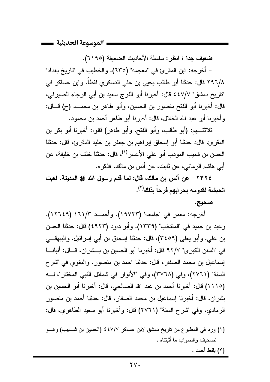 ٢٣٢٤ - عن أنس بن مالك، قال: لما قدم رسول اللّه - صلى الله عليه وسلم - المدينة، لعبت الحبشة لقدومه بحرابهم فرحًا بذلك (¬٢).