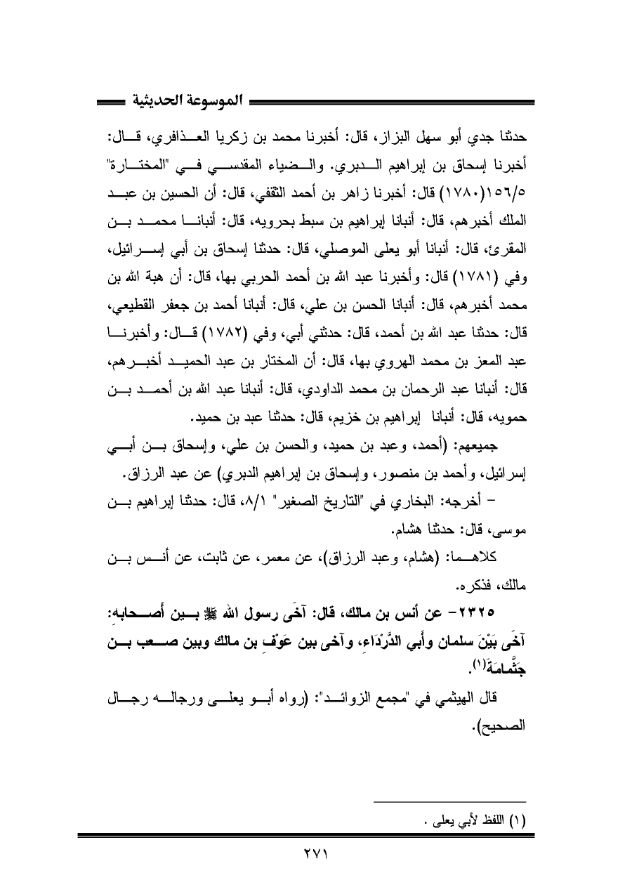 ٢٣٢٥ - عن أنس بن مالك، قال: آخَى رسول اللّه - صلى الله عليه وسلم - بين أصحابهِ: آخَى بَيْنَ سلمان وأبي الدَّرْدَاءِ، وآخى بين عَوْف بن مالك وبين صعب بن جَثَّمامَةَ (¬١).