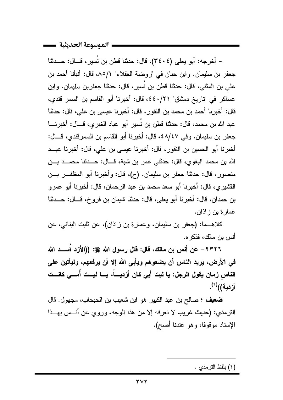 - أخرجه: أبو يعلى (٣٤٠٤)، قال: حَدَّثَنَا قطن بن نُسير، قال: حَدَّثَنَا جعفر بن سليمان. وابن حبان في "روضة العقلاء" ١/ ٨٥، قال: أنبأنا أحمد بن علي بن المثنى، قال: حَدَّثَنَا قطن بن نُسير، قال: حَدَّثَنَا جعفر بن سليمان. وابن عساكر في "تاريخ دمشق" ٢١/ ٤٤٠، قال: أخبرنا أبو القاسم بن السمرقندي، قال: أخبرنا أحمد بن محمد بن النقور، قال: أخبرنا عيسى بن علي، قال: حَدَّثَنَا عبد اللّه بن محمد، قال: حَدَّثَنَا قطن بن نُسير أبو عباد الغبري، قال: أخبرنا جعفر بن سليمان. وفي ٤٧/ ٤٨، قال: أخبرنا أبو القاسم بن السمرقندي، قال: أخبرنا أبو الحسين بن النقور، قال: أخبرنا عيسى بن علي، قال: أخبرنا عبد اللّه بن محمد البغوي، قال: حدثني عمر بن شبة، قال: حَدَّثَنَا محمد بن منصور، قال: حَدَّثَنَا جعفر بن سليمان. (ح)، قال: وأخبرنا أبو المظفر بن القشيري، قال: أخبرنا أبو سعد محمد بن عبد الرحمان، قال: أخبرنا أبو عمرو بن حمدان، قال: أخبرنا أبو يعلى، قال: حَدَّثَنَا شيبان بن فروخ، قال: حَدَّثَنَا عمارة بن زاذان.