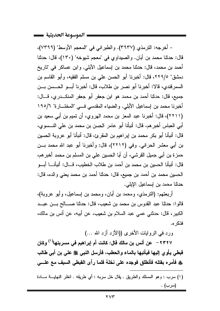 ٢٣٢٧ - عن أنس بن مالك قال: كانت أم إبراهيم في مسربتها (¬١) وكان قبطي يأوي إليها فيأتيها بالماء والحطب، فأرسل النَّبِيّ - صلى الله عليه وسلم - علي بن أبي طالب - رضي الله عنه - فأمره بقتله فأنطلق فوجده على نخلة فلما رأى القبطي السيف مع علي