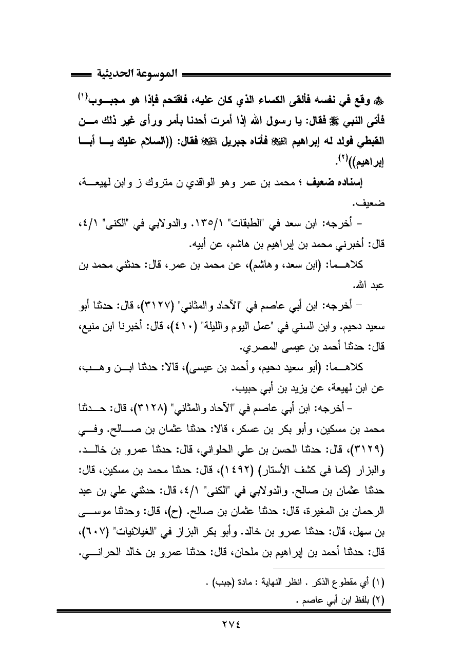 - أخرجه: ابن سعد في "الطبقات" ١/ ١٣٥. والدولابي في "الكنى" ١/ ٤، قال: أخبرني محمد بن إبراهيم بن هاشم، عن أبيه.