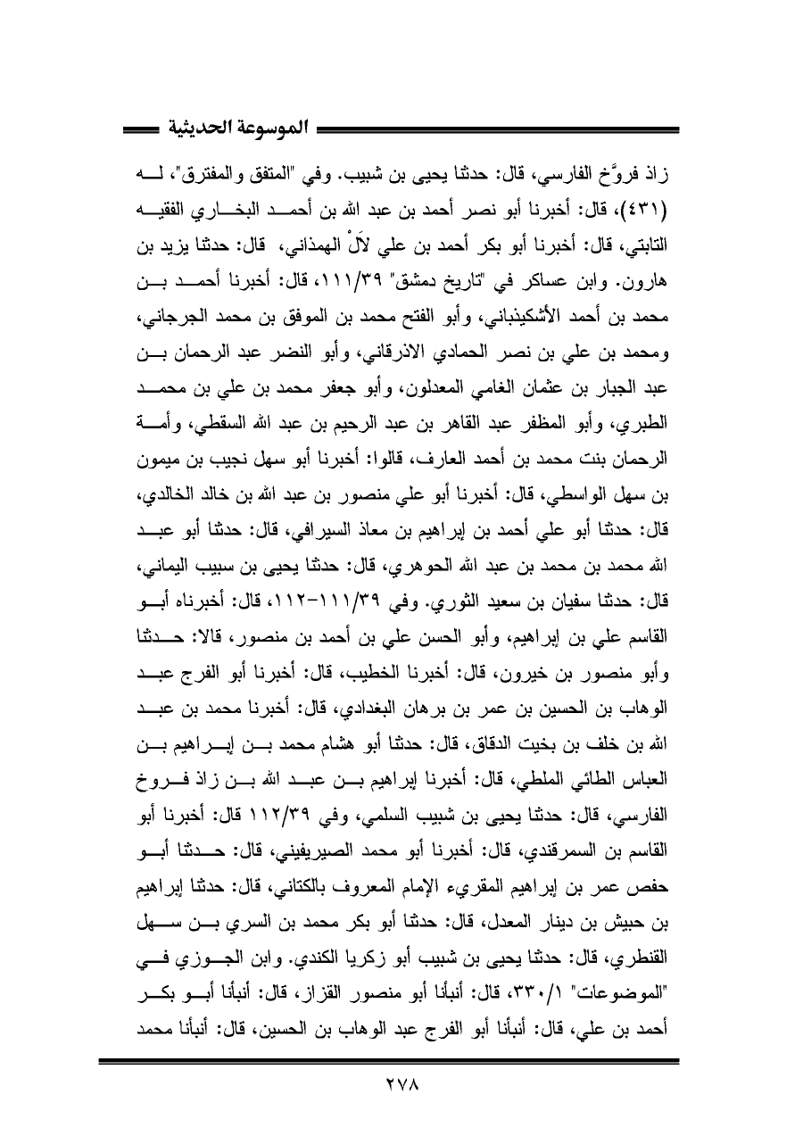 زاذ فروَّخ الفارسي، قال: حَدَّثَنَا يحيى بن شبيب. وفي "المتفق والمفترق"، له (٤٣١)، قال: أخبرنا أبو نصر أحمد بن عبد اللّه بن أحمد البخاري الفقيه التابتي، قال: أخبرنا أبو بكر أحمد بن علي لَالْ الهمذاني، قال: حَدَّثَنَا يزيد بن هارون. وابن عساكر في "تاريخ دمشق" ٣٩/ ١١١، قال: أخبرنا أحمد بن محمد بن أحمد الأشكيذباني، وأبو الفتح محمد بن الموفق بن محمد الجرجاني، ومحمد بن علي بن نصر الحمادي الاذرقاني، وأبو النضر عبد الرحمان بن عبد الجبار بن عثمان الغامي المعدلون، وأبو جعفر محمد بن علي بن محمد الطبري، وأبو المظفر عبد القاهر بن عبد الرحيم بن عبد اللّه السقطي، وأمة الرحمان بنت محمد بن أحمد العارف، قالوا: أخبرنا أبو سهل نجيب بن ميمون بن سهل الواسطي، قال: أخبرنا أبو علي منصور بن عبد اللّه بن خالد الخالدي، قال: حَدَّثَنَا أبو علي أحمد بن إبراهيم بن معاذ السيرافي، قال: حَدَّثَنَا أبو عبد اللّه محمد بن محمد بن عبد اللّه الحوهري، قال: حَدَّثَنَا يحيى بن سبيب اليماني، قال: حَدَّثَنَا سفيان بن سعيد الثوري. وفي ٣٩/ ١١١ - ١١٢، قال: أخبرناه أبو القاسم علي بن إبراهيم، وأبو الحسن علي بن أحمد بن منصور، قالا: حَدَّثَنَا وأبو منصور بن خيرون، قال: أخبرنا الخطيب، قال: أخبرنا أبو الفرج عبد الوهاب بن الحسين بن عمر بن بكرهان البغدادي، قال: أخبرنا محمد بن عبد اللّه بن خلف بن بخيت الدقاق، قال: حَدَّثَنَا أبو هشام محمد بن إبراهيم بن العباس الطائي الملطي، قال: أخبرنا إبراهيم بن عبد اللّه بن زاذ فروخ الفارسي، قال: حَدَّثَنَا يحيى بن شبيب السلمي، وفي ٣٩/ ١١٢ قال: أخبرنا أبو القاسم بن السمرقندي، قال: أخبرنا أبو محمد الصيريفيني، قال: حَدَّثَنَا أبو حفص عمر بن إبراهيم المقريء الإمام المعروف بالكتاني، قال: حَدَّثَنَا إبراهيم بن حبيش بن دينار المعدل، قال: حَدَّثَنَا أبو بكر محمد بن السري بن سهل القنطري، قال: حَدَّثَنَا يحيى بن شبيب أبو زكريا الكندي. وابن الجوزي في "الموضوعات" ١/ ٣٣٠، قال: أنبأنا أبو منصور القزاز، قال: أنبأنا أبو بكر أحمد بن علي، قال: أنبأنا أبو الفرج عبد الوهاب بن الحسين، قال: أنبأنا محمد