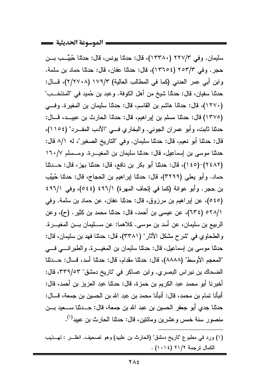 سليمان. وفي ٣/ ٢٢٧ (١٣٣٨٠)، قال: حَدَّثَنَا يونس، قال: حَدَّثَنَا حُبيِّب بن حجر. وفي ٣/ ٢٥٣ (١٣٦٥٤)، قال: حَدَّثَنَا عفان، قال: حَدَّثَنَا حماد بن سلمة. وابن أبي عمر العدني (كما في المطالب العالية) ٣/ ١٧٩ (٢٧٠٨/ ٢)، قال: حَدَّثَنَا سفيان، قال: حَدَّثَنَا شيخ من أهل الكوفة. وعبد بن حُميد في "المنتخب" (١٢٧٠)، قال: حَدَّثَنَا هاشم بن القاسم، قال: حَدَّثَنَا سليمان بن المغيرة. وفي (١٣٧٥) قال: حَدَّثَنَا مسلم بن إبراهيم، قال: حَدَّثَنَا الحارث بن عبيد، قال: حَدَّثَنَا ثابت، وأبو عمران الجوني. والبخاري في "الأدب المفرد" (١١٥٤)، قال: حَدَّثَنَا أبو نعيم، قال: حَدَّثَنَا سليمان. وفي "التاريخ الصغير"، له ١/ ٨ قال: حَدَّثَنَا موسى بن إسماعيل، قال: حَدَّثَنَا سليمان بن المغيرة. ومسلم ٧/ ١٦٠ (٢٤٨٢) - (١٤٥)، قال: حَدَّثَنَا أبو بكر بن نافع، قال: حَدَّثَنَا بهز، قال: حَدَّثَنَا حماد. وأبو يعلى (٣٢٩٩)، قال: حَدَّثَنَا إبراهيم بن الحجاج، قال: حَدَّثَنَا حُبيِّب بن حجر. وأبو عوانة (كما في إتحاف المهرة) ١/ ٤٩٦ (٥٤٤)، وفي ١/ ٤٩٦ (٥٤٥)، عن إبراهيم بن مرزوق، قال: حَدَّثَنَا عفان، عن حماد بن سلمة. وفي ١/ ٥٢٨ (٦٣٤)، عن عيسى بن أحمد، قال: حَدَّثَنَا محمد بن كثير. (ح)، وعن الربيع بن سليمان، عن أسد بن موسى. كلاهما: عن سليمان بن المغيرة. والطحاوي في "شرح مشكل الآثار" (٣٣٨١)، قال: حَدَّثَنَا فهد بن سليمان، قال: حَدَّثَنَا موسى بن إسماعيل، قال: حَدَّثَنَا سليمان بن المغيرة. والطبراني في "المعجم الأوسط" (٨٨٨٨)، قال: حَدَّثَنَا مقدام، قال: حَدَّثَنَا أسد، قال: حَدَّثَنَا الضحاك بن نبراس البصري. وابن عساكر في "تاريخ دمشق" ٥٣/ ٣٣٩، قال: أخبرنا أبو محمد عبد الكريم بن حمزة، قال: حَدَّثَنَا عبد العزيز بن أحمد، قال: أنبأنا تمام بن محمد، قال: أنبأنا محمد بن عبد اللّه بن الحسين بن جمعة، قال: حَدَّثَنَا جدي أبو جعفر الحسين بن عبد اللّه بن جمعة، قال: حَدَّثَنَا سعيد بن منصور سنة خمس وعشرين ومائتين، قال: حَدَّثَنَا الحارث بن عبيد (¬١).