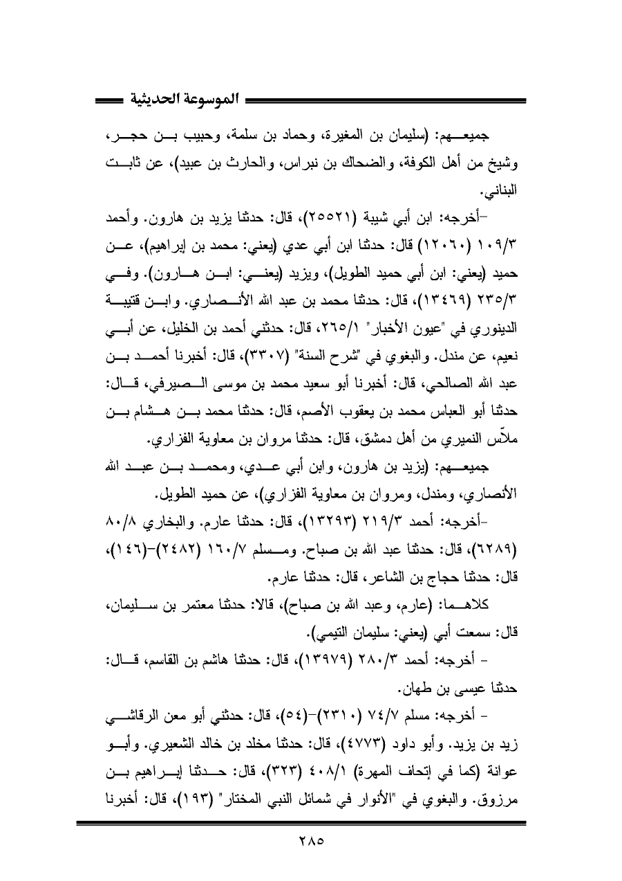 جميعهم: (سليمان بن المغيرة، وحماد بن سلمة، وحبيب بن حجر، وشيخ من أهل الكوفة، والضحاك بن نبراس، والحارث بن عبيد)، عن ثابت البناني.