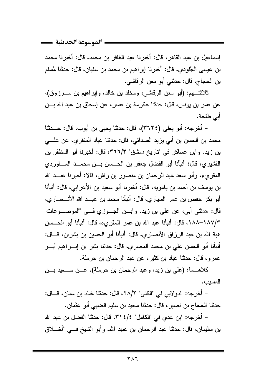 ثلاثتهم: (أبو معن الرقاشي، ومخلد بن خالد، وإبراهيم بن مرزوق)، عن عمر بن يونس، قال: حَدَّثَنَا عكرمة بن عمار، عن إسحاق بن عبد اللّه بن أبي طلحة.