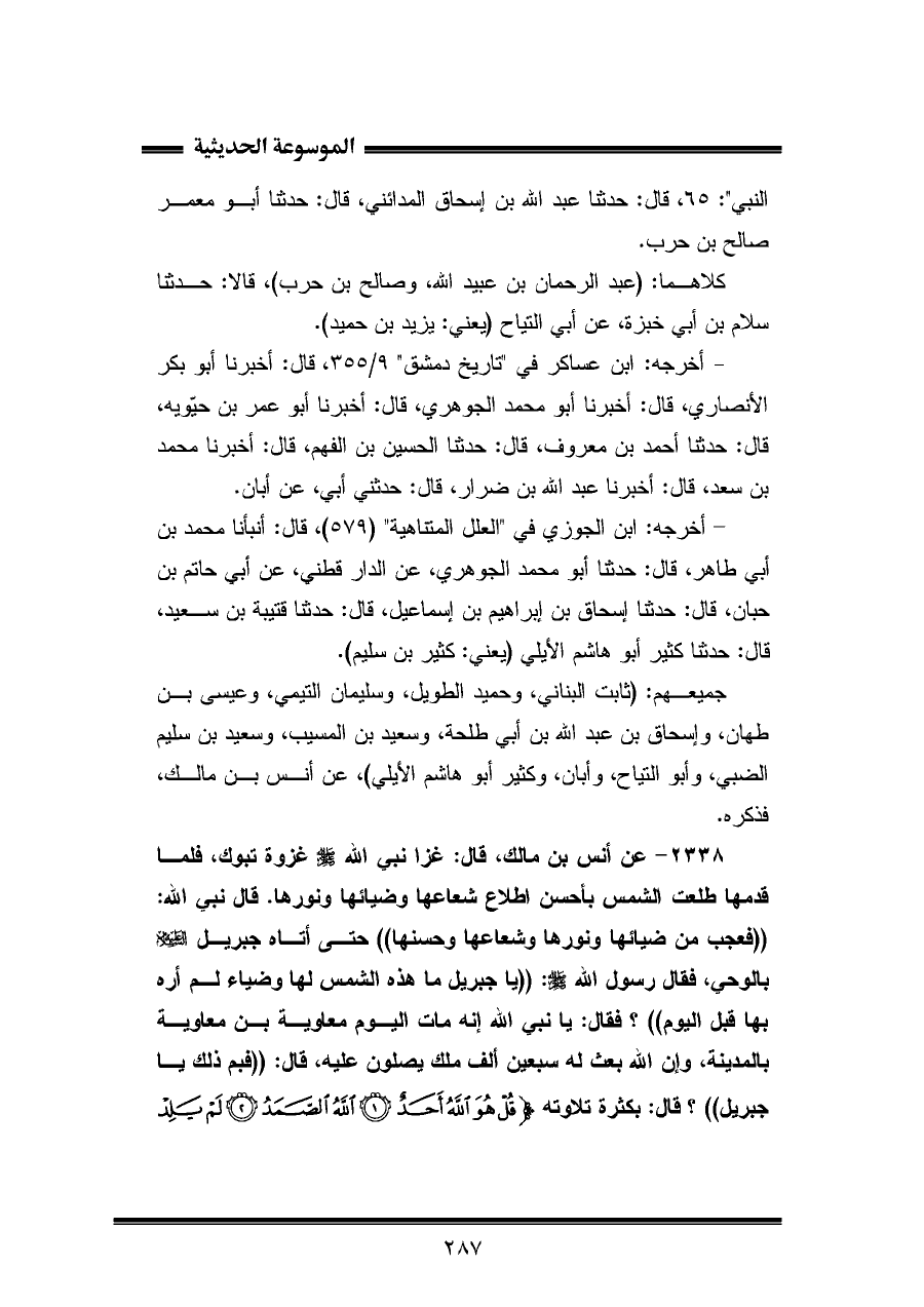 ٢٣٣٨ - عن أنس بن مالك، قال: غزا نبي اللّه - صلى الله عليه وسلم - غزوة تبوك، فلما قدمها طلعت الشمس بأحسن اطلاع شعاعها وضيائها ونورها. قال نبي اللّه: "فعجب من ضيائها ونورها وشعاعها وحسنها" حتى أتاه جبريل - عَلَيْهِ السَّلَامِ - بالوحي، فقال رسول اللّه - صلى الله عليه وسلم -: "يا جبريل ما هذه الشمس لها وضياء لم أره بها قبل اليوم"؟ فقال: يا نبي اللّه إنه مات اليوم معاوية بن معاوية بالمدينة، وإن اللّه بعث له سبعين ألف ملك يصلون عليه، قال: "فبم ذلك يا جبريل"؟ قال: بكثرة تلاوته {قُلْ هُوَ اللَّهُ أَحَدٌ (١) اللَّهُ الصَّمَدُ (٢) لَمْ يَلِدْ