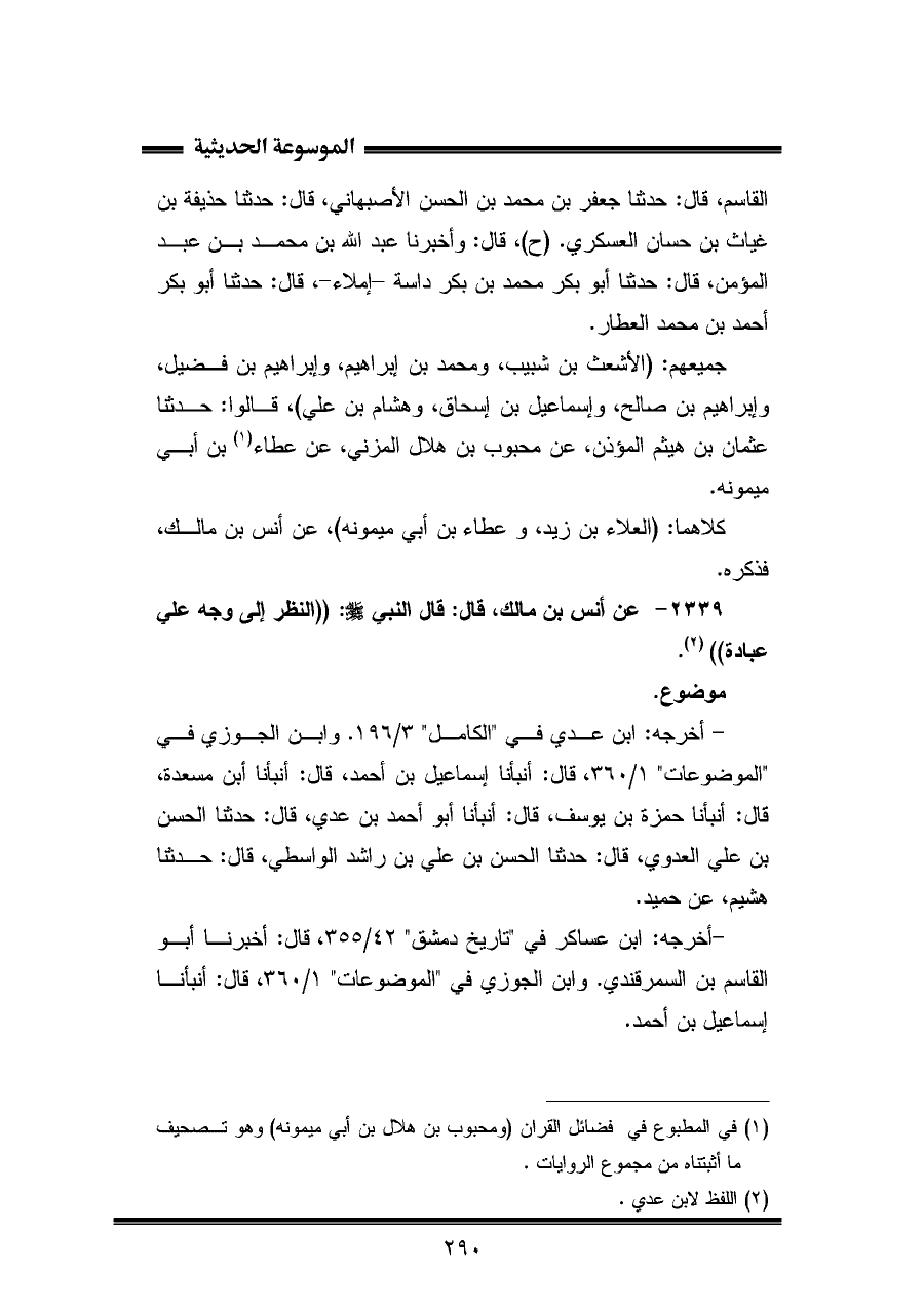 ٢٣٣٩ - عن أنس بن مالك، قال: قال النَّبِيّ - صلى الله عليه وسلم -: "النظر إلى وجه علي عبادة" (¬٢).