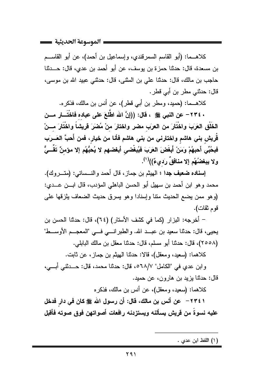 ٢٣٤٠ - عن النَّبِيّ - صلى الله عليه وسلم -، قال: "إنَّ اللّه اطَّلعَ على عبادِهِ فاخْتَار من الخَلْق العَرَبَ واخْتَارَ من العرَبِ مضر واختارَ مِنْ مُضَرَ قريشًا واخْتَارَ مِنْ قُريشٍ بني هاشمٍ واختارني من بني هاشم فأنا من خيارٍ، فمن أحبَّ العَرَب فبحُبِّي أحبهُمْ وَمَنْ أبغَضَ العَرَبَ فبُبغْضي أبغضهم لا يُحبُّهُم إِلَّا مؤمِنٌ تَقِّيٌّ ولا يبغضُهُم إِلَّا منافقٌ رَدِيءٌ" (¬١).