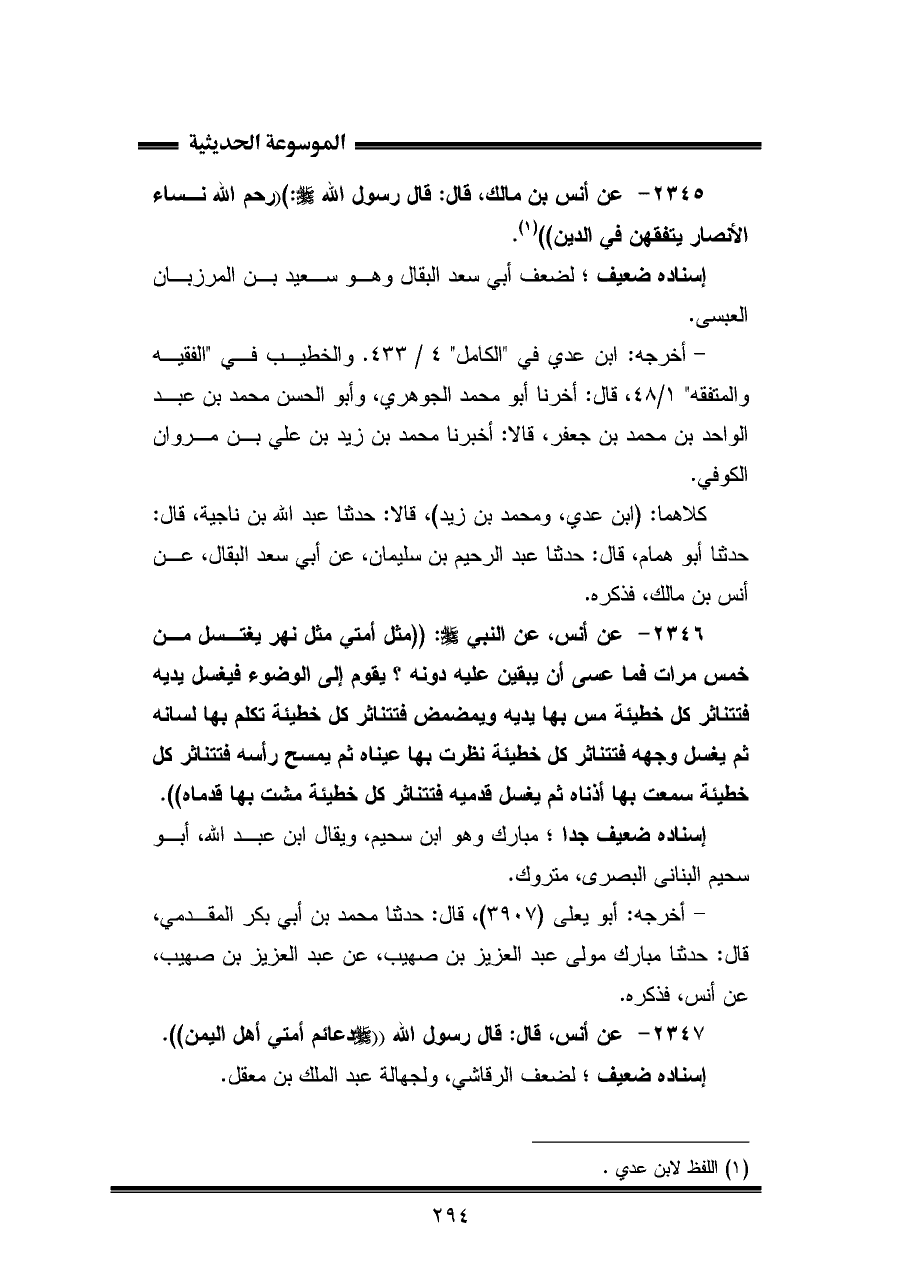 كلاهما: (ابن عدي، ومحمد بن زيد)، قالا: حَدَّثَنَا عبد اللّه بن ناجية، قال: حَدَّثَنَا أبو همام، قال: حَدَّثَنَا عبد الرحيم بن سليمان، عن أبي سعد البقال، عن أنس بن مالك، فذكره.
