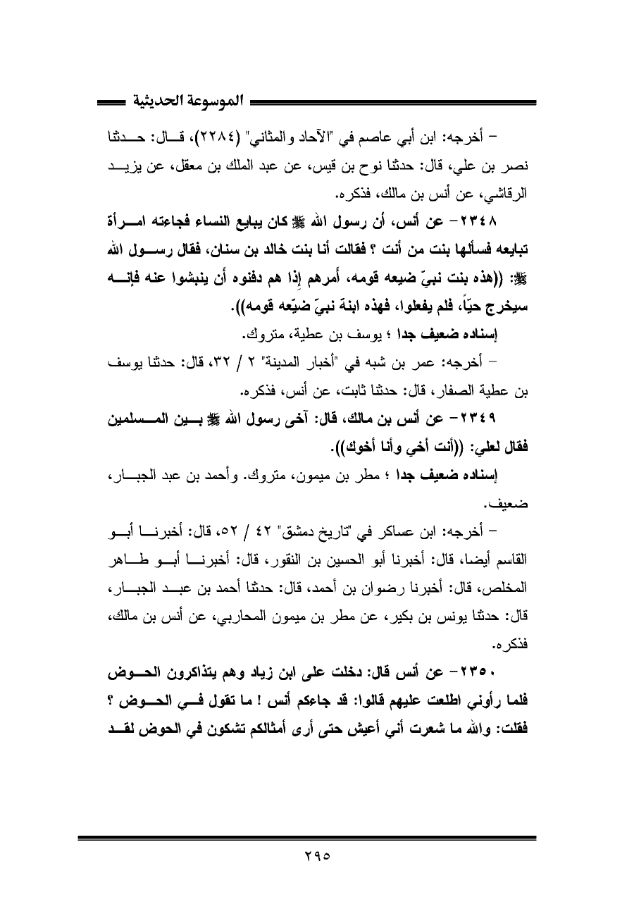 - أخرجه: عمر بن شبه في "أخبار المدينة" ٢/ ٣٢، قال: حَدَّثَنَا يوسف بن عطية الصفار، قال: حَدَّثَنَا ثابت، عن أنس، فذكره.