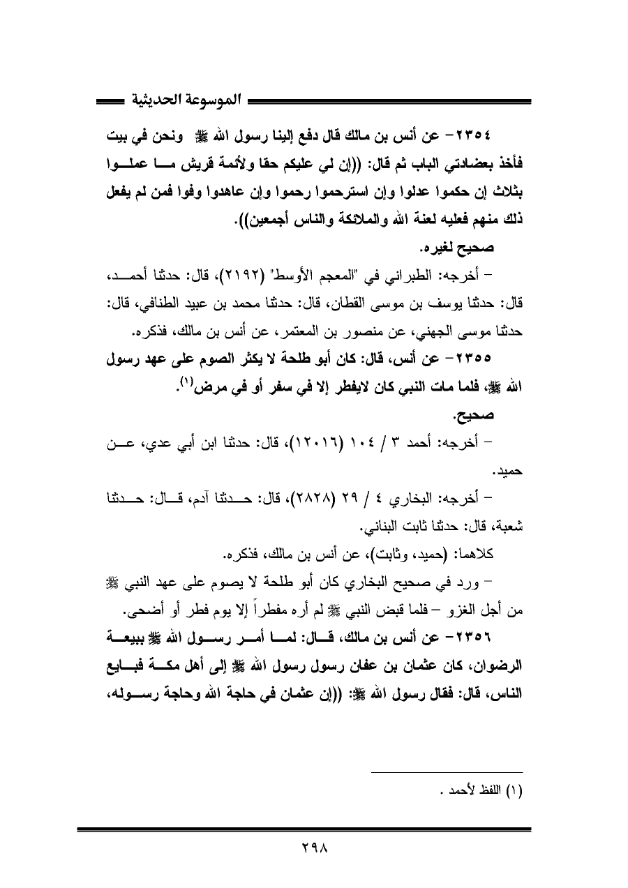 ٢٣٥٤ - عن أنس بن مالك قال دفع إلينا رسول اللّه - صلى الله عليه وسلم - ونحن في بيت فأخذ بعضادتي الباب ثم قال: "إن لي عليكم حقا ولأئمة قريش ما عملوا بثلاث إن حكموا عدلوا وإن استرحموا رحموا وإن عاهدوا وفوا فمن لم يفعل ذلك منهم فعليه لعنة اللّه والملائكة والناس أجمعين".