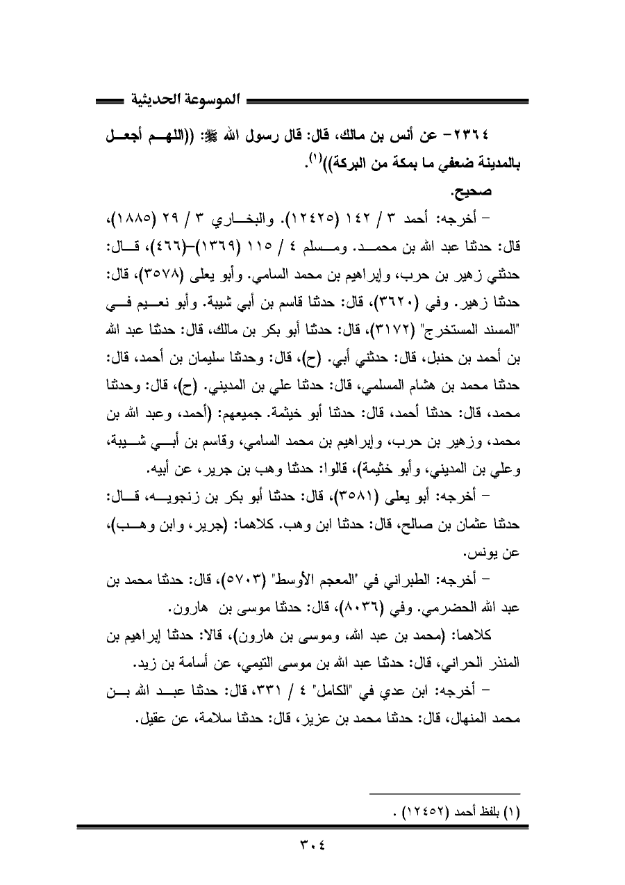 ٢٣٦٤ - عن أنس بن مالك، قال: قال رسول اللّه - صلى الله عليه وسلم -: "اللهم اجعل بالمدينة ضعفي ما بمكة من البركة" (¬١).