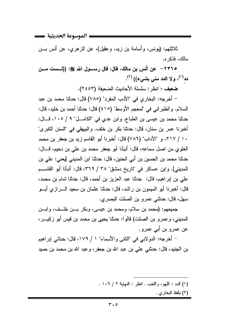 ٢٣٦٥ - عن أنس بن مالك، قال: قال رسول اللّه - صلى الله عليه وسلم -: "لست من ددٍ (¬١)، ولا الدد مني بشيء" (¬٢).