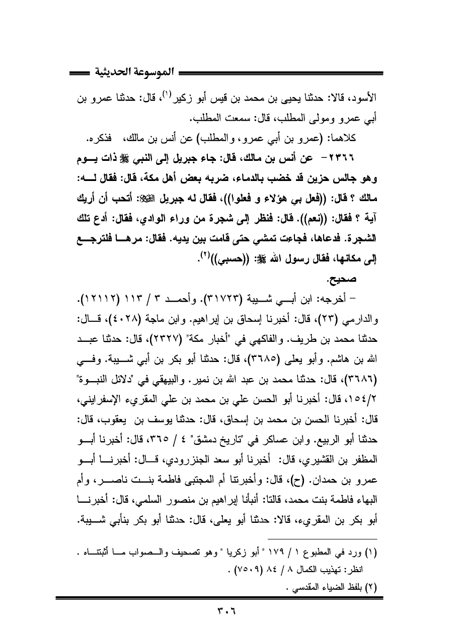 ٢٣٦٦ - عن أنس بن مالك، قال: جاء جبريل إلى النَّبِيّ - صلى الله عليه وسلم - ذات يوم وهو جالس حزين قد خضب بالدماء، ضربه بعض أهل مكة، قال: فقال له: ما لك؟ قال: "فعل بي هؤلاء وفعلوا"، فقال له جبريل - عَلَيْهِ السَّلَامِ -: أتحب أن أريك آية؟ فقال: "نعم". قال: فنظر إلى شجرة من وراء الوادي، فقال: أدع تلك الشجرة. فدعاها، فجاءت تمشي حتى قامت بين يديه. فقال: مرها فلترجع إلى مكانها، فقال رسول اللّه - صلى الله عليه وسلم -: "حسبي" (¬٢).