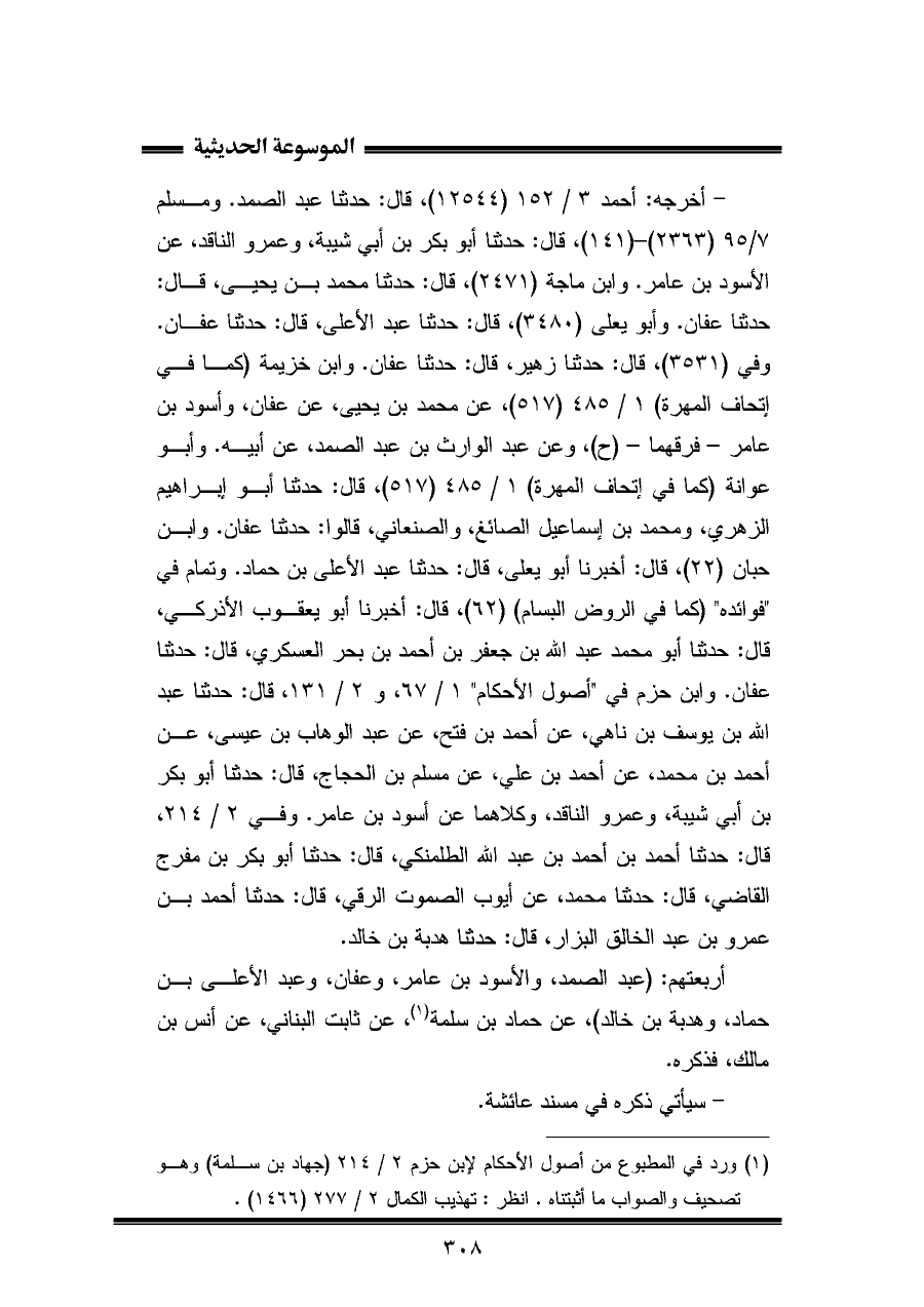 (¬١) ورد في المطبوع من أصول الأحكام لابن حزم ٢/ ٢١٤ (جهاد بن سلمة) وهو تصحيف والصواب ما أثبتناه. انظر: تهذيب الكمال ٢/ ٢٧٧ (١٤٦٦).