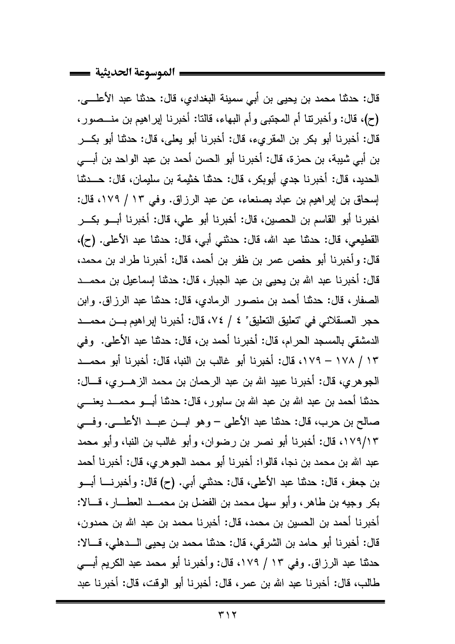 قال: حَدَّثَنَا محمد بن يحيى بن أبي سمينة البغدادي، قال: حَدَّثَنَا عبد الأعلى. (ح)، قال: وأخبرتنا أم المجتبى وأم البهاء، قالتا: أخبرنا إبراهيم بن منصور، قال: أخبرنا أبو بكر بن المقريء، قال: أخبرنا أبو يعلى، قال: حَدَّثَنَا أبو بكر بن أبي شيبة، بن حمزة، قال: أخبرنا أبو الحسن أحمد بن عبد الواحد بن أبي الحديد، قال: أخبرنا جدي أبو بكر، قال: حَدَّثَنَا خثيمة بن سليمان، قال: حَدَّثَنَا إسحاق بن إبراهيم بن عباد بصنعاء، عن عبد الرزاق. وفي ١٣/ ١٧٩، قال: أخبرنا أبو القاسم بن الحصين، قال: أخبرنا أبو علي، قال: أخبرنا أبو بكر القطيعي، قال: حَدَّثَنَا عبد اللّه، قال: حدثني أبي، قال: حَدَّثَنَا عبد الأعلى. (ح)، قال: وأخبرنا أبو حفص عمر بن ظفر بن أحمد، قال: أخبرنا طراد بن محمد، قال: أخبرنا عبد اللّه بن يحيى بن عبد الجبار، قال: حَدَّثَنَا إسماعيل بن محمد الصفار، قال: حَدَّثَنَا أحمد بن منصور الرمادي، قال: حَدَّثَنَا عبد الرزاق. وابن حجر العسقلاني في "تعليق التعليق" ٤/ ٧٤، قال: أخبرنا إبراهيم بن محمد الدمشقي بالمسجد الحرام، قال: أخبرنا أحمد بن، قال: حَدَّثَنَا عبد الأعلى. وفي ١٣/ ١٧٨ - ١٧٩، قال: أخبرنا أبو غالب بن النبا، قال: أخبرنا أبو محمد الجوهري، قال: أخبرنا عبيد اللّه بن عبد الرحمان بن محمد الزُّهري، قال: حَدَّثَنَا أحمد بن عبد اللّه بن عبد اللّه بن سابور، قال: حَدَّثَنَا أبو محمد يعني صالح بن حرب، قال: حَدَّثَنَا عبد الأعلى - وهو ابن عبد الأعلى. وفي ١٣/ ١٧٩، قال: أخبرنا أبو نصر بن رضوان، وأبو غالب بن النبا، وأبو محمد عبد اللّه بن محمد بن نجا، قالوا: أخبرنا أبو محمد الجوهري، قال: أخبرنا أحمد بن جعفر، قال: حَدَّثَنَا عبد الأعلى، قال: حدثني أبي. (ح) قال: وأخبرنا أبو بكر وجيه بن طاهر، وأبو سهل محمد بن الفضل بن محمد العطار، قالا: أخبرنا أحمد بن الحسين بن محمد، قال: أخبرنا محمد بن عبد اللّه بن حمدون، قال: أخبرنا أبو حامد بن الشرقي، قال: حَدَّثَنَا محمد بن يحيى الدهلي، قالا: حَدَّثَنَا عبد الرزاق. وفي ١٣/ ١٧٩، قال: وأخبرنا أبو محمد عبد الكريم أبي طالب، قال: أخبرنا عبد اللّه بن عمر، قال: أخبرنا أبو الوقت، قال: أخبرنا عبد