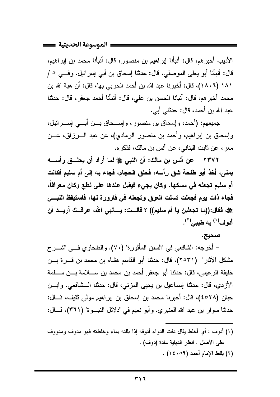 - أخرجه: الشافعي في "السنن المأثورة" (٧٠). والطحاوي في "شرح مشكل الآثار" (٢٥٣١)، قال: حدثنا أبو القاسم هشام بن محمد بن قرة بن خليفة الرعيني، قال: حدثنا أبو جعفر أحمد بن محمد بن سلامة بن سلمة الأزدي، قال: حدثنا إسماعيل بن يحيى المزني، قال: حدثنا الشافعي. وابن حبان (٤٥٢٨)، قال: أخبرنا محمد بن إسحاق بن إبراهيم مولى ثقيف، قال: حدثنا سوار بن عبد اللَّه العنبري. وأبو نعيم في "دلائل النبوة" (٣٦١)، قال: