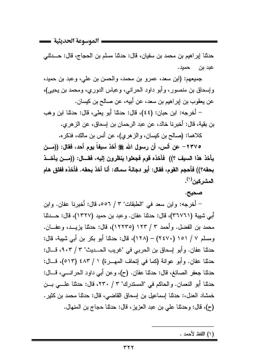 ٢٣٧٥ - عن أنس، أن رسول اللَّه -صلى اللَّه عليه وسلم- أخذ سيفًا يوم أحد، فقال: "من يأخذ هذا السيف؟ " فأخذه قوم فجعلوا ينظرون إليه، فقال: "من يأخذ بحقه؟ " فأحجم القوم، فقال: أبو دجانة سماك: أنا أخذ بحقه. فأخذه ففلق هام المشركين (¬١).