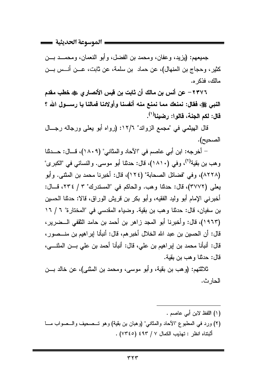 ٢٣٧٦ - عن أنس بن مالك أن ثابت بن قيس الأنصاري -رضي اللَّه عنه- خطب مقدم النبي -صلى اللَّه عليه وسلم-، فقال: نمنعك مما نمنع منه أنفسنا وأولادنا فمالنا يا رسول اللَّه؟ قال: لكم الجنة، قالوا: رضينا (¬١).