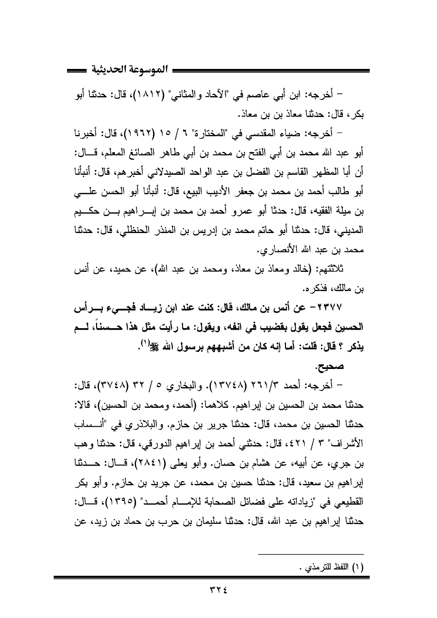 ٢٣٧٧ - عن أنس بن مالك، قال: كنت عند ابن زياد فجيء برأس الحسين فجعل يقول بقضيب في انفه، ويقول: ما رأيت مثل هذا حسنًا، لم يذكر؟ قال: قلت: أما إنه كان من أشبههم برسول اللَّه -صلى اللَّه عليه وسلم- (¬١).