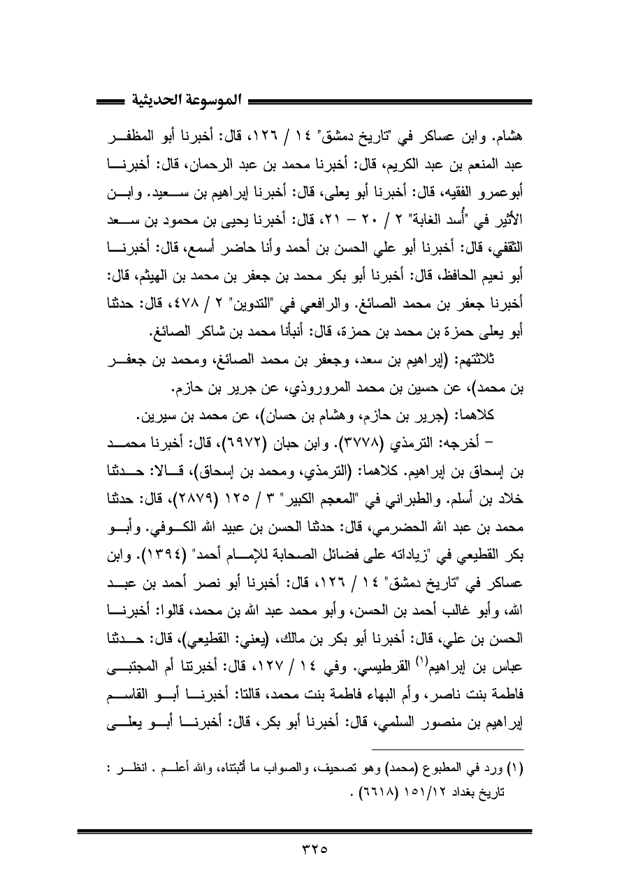 هشام. وابن عساكر في "تاريخ دمشق" ١٤/ ١٢٦، قال: أخبرنا أبو المظفر عبد المنعم بن عبد الكريم، قال: أخبرنا محمد بن عبد الرحمان، قال: أخبرنا أبو عمرو الفقيه، قال: أخبرنا أبو يعلى، قال: أخبرنا إبراهيم بن سعيد. وابن الأثير في "أسد الغابة" ٢/ ٢٠ - ٢١، قال: أخبرنا يحيى بن محمود بن سعد الثقفي، قال: أخبرنا أبو علي الحسن بن أحمد وأنا حاضر أسمع، قال: أخبرنا أبو نعيم الحافظ، قال: أخبرنا أبو بكر محمد بن جعفر بن محمد بن الهيثم، قال: أخبرنا جعفر بن محمد الصائغ. والرافعي في "التدوين" ٢/ ٤٧٨، قال: حدثنا أبو يعلى حمزة بن محمد بن حمزة، قال: أنبأنا محمد بن شاكر الصائغ.