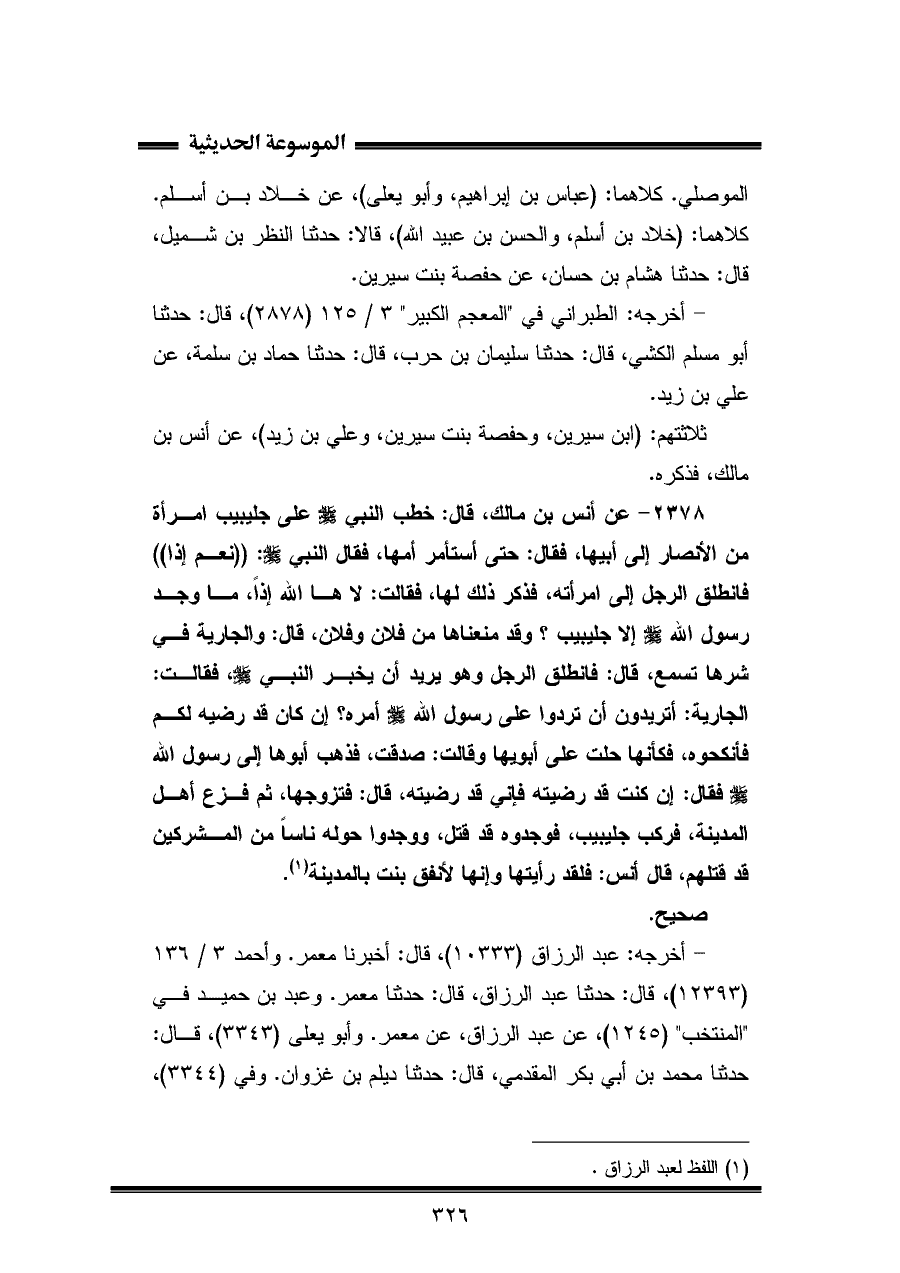 الموصلي. كلاهما: (عباس بن إبراهيم، وأبو يعلى)، عن خلاد بن أسلم. كلاهما: (خلاد بن أسلم، والحسن بن عبيد اللَّه)، قالا: حدثنا النظر بن شميل، قال: حدثنا هشام بن حسان، عن حفصة بنت سيرين.