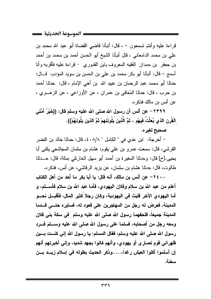 ٢٣٩٩ - عن أنس أن رسول اللَّه صلى اللَّه عليه وسلم قال: "خَيْرُ أمَّتي القَرْن الذي بُعثْتُ فِيهْم، ثمَّ الَّذينَ يَلُونَنهمْ ثمَّ الذين يَلُونهُمْ".