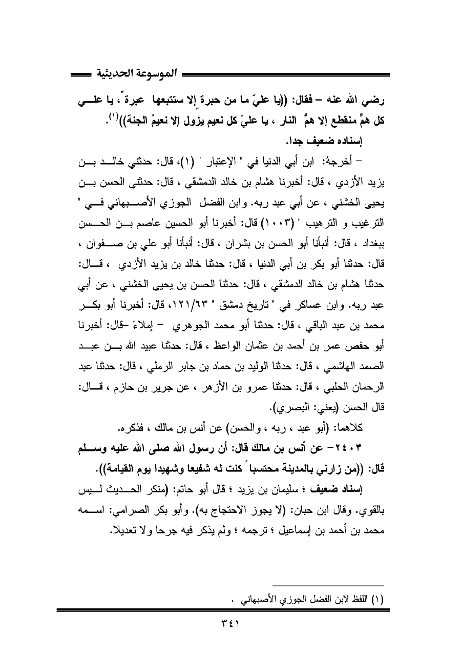رضي اللَّه عنه- فقال: "يا عليّ ما من حبرةٍ إلا ستتبعها عبرةٌ، يا علي كل همٍّ منقطع إلا همُّ النار، يا عليّ كل نعيم يزول إلا نعيم الجنة" (¬١).