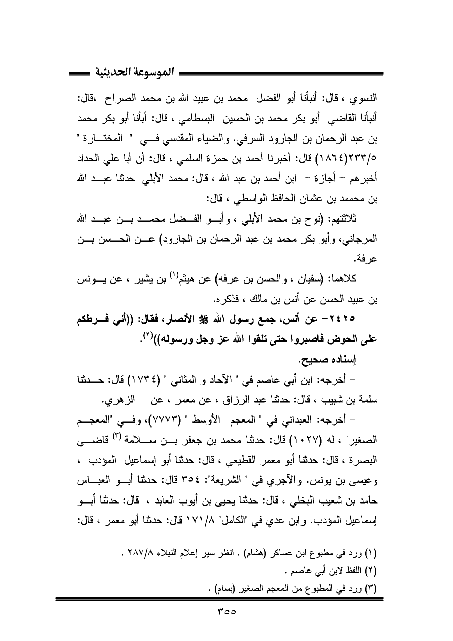٢٤٢٥ - عن أنس، جمع رسول اللَّه -صلى اللَّه عليه وسلم- الأنصار، فقال: "أني فرطكم على الحوض فاصبروا حتى تلقوا اللَّه عز وجل ورسوله" (¬٢).