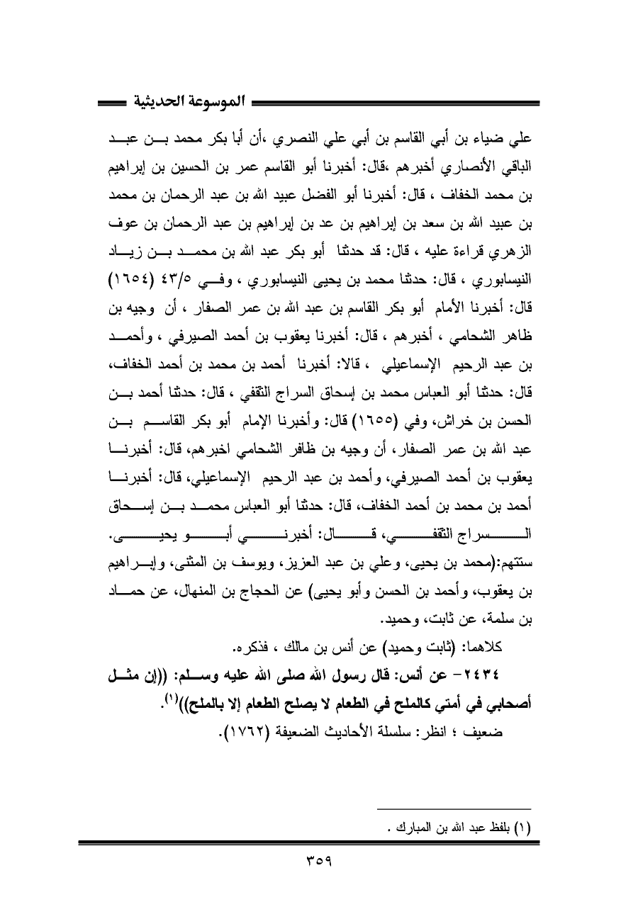 علي ضياء بن أبي القاسم بن أبي علي النصري، أن أبا بكر محمد بن عبد الباقي الأنصاري أخبرهم، قال: أخبرنا أبو القاسم عمر بن الحسين بن إبراهيم بن محمد الخفاف، قال: أخبرنا أبو الفضل عبيد اللَّه بن عبد الرحمان بن محمد بن عبيد اللَّه بن سعد بن إبراهيم بن عبد بن إبراهيم بن عبد الرحمان بن عوف الزهري قراءة عليه، قال: قد حدثنا أبو بكر عبد اللَّه بن محمد بن زياد النيسابوري، قال: حدثنا محمد بن يحيى النيسابوري، وفي ٥/ ٤٣ (١٦٥٤) قال: أخبرنا الإمام أبو بكر القاسم بن عبد اللَّه بن عمر الصفار، أن وجيه بن ظاهر الشحامي، أخبرهم، قال: أخبرنا يعقوب بن أحمد الصيرفي، وأحمد بن عبد الرحيم الإسماعيلي، قالا: أخبرنا أحمد بن محمد بن أحمد الخفاف، قال: حدثنا أبو العباس محمد بن إسحاق السراج الثقفي، قال: حدثنا أحمد بن الحسن بن خراش، وفي (١٦٥٥) قال: وأخبرنا الإمام أبو بكر القاسم بن عبد اللَّه بن عمر الصفار، أن وجيه بن ظافر الشحامي أخبرهم، قال: أخبرنا يعقوب بن أحمد الصيرفي، وأحمد بن عبد الرحيم الإسماعيلي، قال: أخبرنا أحمد بن محمد بن أحمد الخفاف، قال: حدثنا أبو العباس محمد بن إسحاق السراج الثقفي، قال: أخبرني أبو يحيى. ستتهم: (محمد بن يحيى، وعلي بن عبد العزيز، ويوسف بن المثنى، وإبراهيم بن يعقوب، وأحمد بن الحسن وأبو يحيى) عن الحجاج بن المنهال، عن حماد بن سلمة، عن ثابت، وحميد.