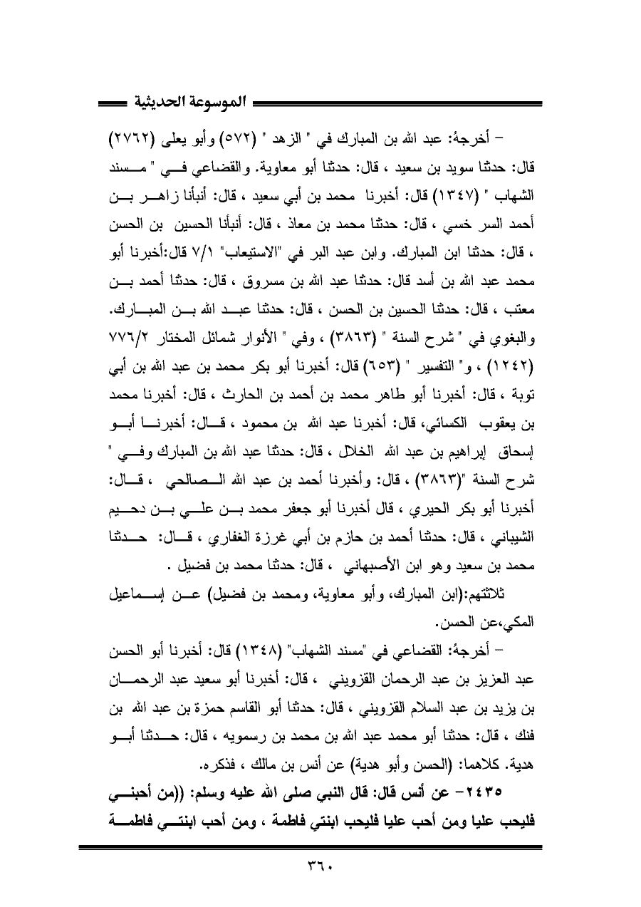 - أخرجهُ: عبد اللَّه بن المبارك في "الزهد" (٥٧٢) وأبو يعلى (٢٧٦٢) قال: حدثنا سويد بن سعيد، قال: حدثنا أبو معاوية. والقضاعي في "مسند الشهاب" (١٣٤٧) قال: أخبرنا محمد بن أبي سعيد، قال: أنبأنا زاهر بن أحمد السرخسي، قال: حدثنا محمد بن معاذ، قال: أنبأنا الحسين بن الحسن، قال: حدثنا ابن المبارك. وابن عبد البر في "الاستيعاب" ١/ ٧ قال: أخبرنا أبو محمد عبد اللَّه بن أسد قال: حدثنا عبد اللَّه بن مسروق، قال: حدثنا أحمد بن معتب، قال: حدثنا الحسين بن الحسن، قال: حدثنا عبد اللَّه بن المبارك. والبغوي في "شرح السنة" (٣٨٦٣)، وفي "الأنوار شمائل المختار" ٢/ ٧٧٦ (١٢٤٢)، و"التفسير" (٦٥٣) قال: أخبرنا أبو بكر محمد بن عبد اللَّه بن أبي توبة، قال: أخبرنا أبو طاهر محمد بن أحمد بن الحارث، قال: أخبرنا محمد بن يعقوب الكسائي، قال: أخبرنا عبد اللَّه بن محمود، قال: أخبرنا أبو إسحاق إبراهيم بن عبد اللَّه الخلال، قال: حدثنا عبد اللَّه بن المبارك وفي "شرح السنة" (٣٨٦٣)، قال: وأخبرنا أحمد بن عبد اللَّه الصالحي، قال: أخبرنا أبو بكر الحيري، قال أخبرنا أبو جعفر محمد بن علي بن دحيم الشيباني، قال: حدثنا أحمد بن حازم بن أبي غرزة الغفاري، قال: حدثنا محمد بن سعيد وهو ابن الأصبهاني، قال: حدثنا محمد بن فضيل.