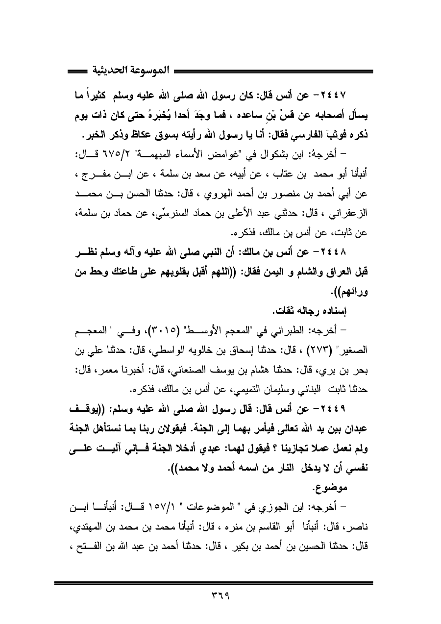 ٢٤٤٧ - عن أنس قال: كان رسول اللَّه صلى اللَّه عليه وسلم كثيرًا ما يسأل أصحابه عن قسِّ بْنِ ساعده، فما وجَدَ أحدا يُخبَرهُ حتى كان ذات يوم ذكره فوثبَ الفارسي فقال: أنا يا رسول اللَّه رأيته بسوق عكاظ وذكر الخبر.