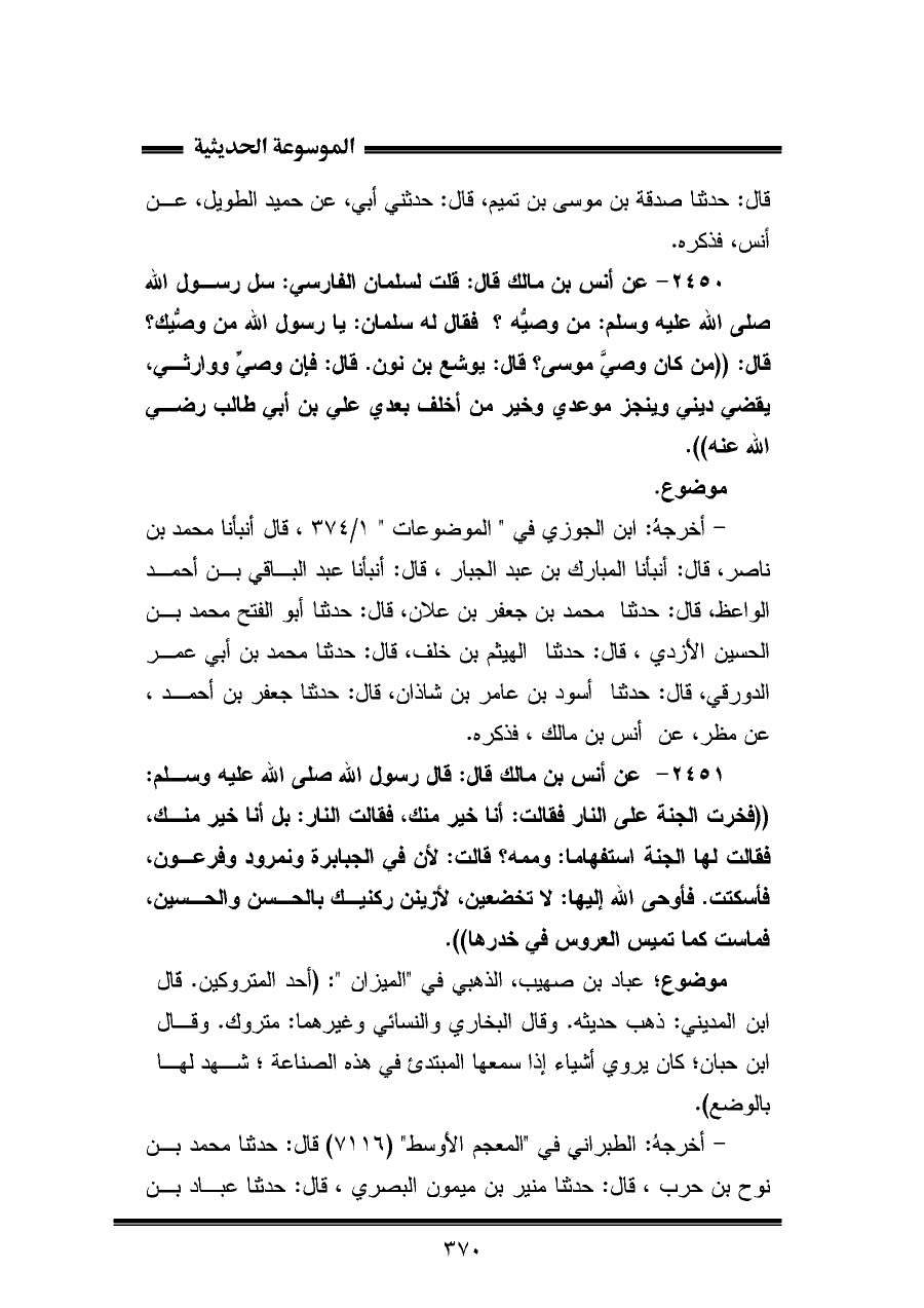 ٢٤٥٠ - عن أنس بن مالك قال: قلت لسلمان الفارسي: سل رسول اللَّه صلى اللَّه عليه وسلم: من وصيُّه؟ فقال له سلمان: يا رسول اللَّه من وصيُّك؟ قال: "من كان وصيَّ موسى؟ قال: يوشع بن نون. قال: فإن وصيِّ ووارثي، يقضي ديني وينجز موعدي وخير من أخلف بعدي علي بن أبي طالب رضي اللَّه عنه".