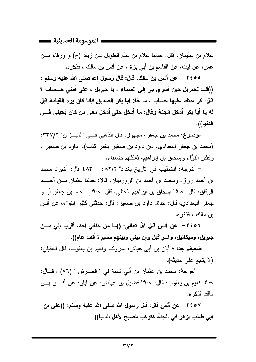 ٢٤٥٥ - عن أنس بن مالك، قال: قال رسول اللَّه صلى اللَّه عليه وسلم: "قلت لجبريل حين أسري بي إلى السماء، يا جبريل، على أمتي حساب؟ قال: كل أمتك عليها حساب، ما خلا أبا بكر الصديق فإذا كان يوم القيامة قيل له يا أبا بكر أدخل الجنة وقال: ما أدخل حتى أدخل معي من كان يُحبني في الدنيا".
