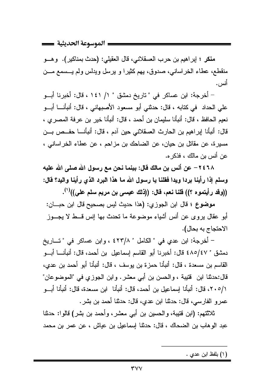 منكر، إبراهيم بن حرب العسقلاني، قال العقيلي: (حدث بمناكير). وهو منقطع، عطاء الخراساني، صدوق، يهم كثيرا ويرسل ويدلس ولم يسمع من أنس.