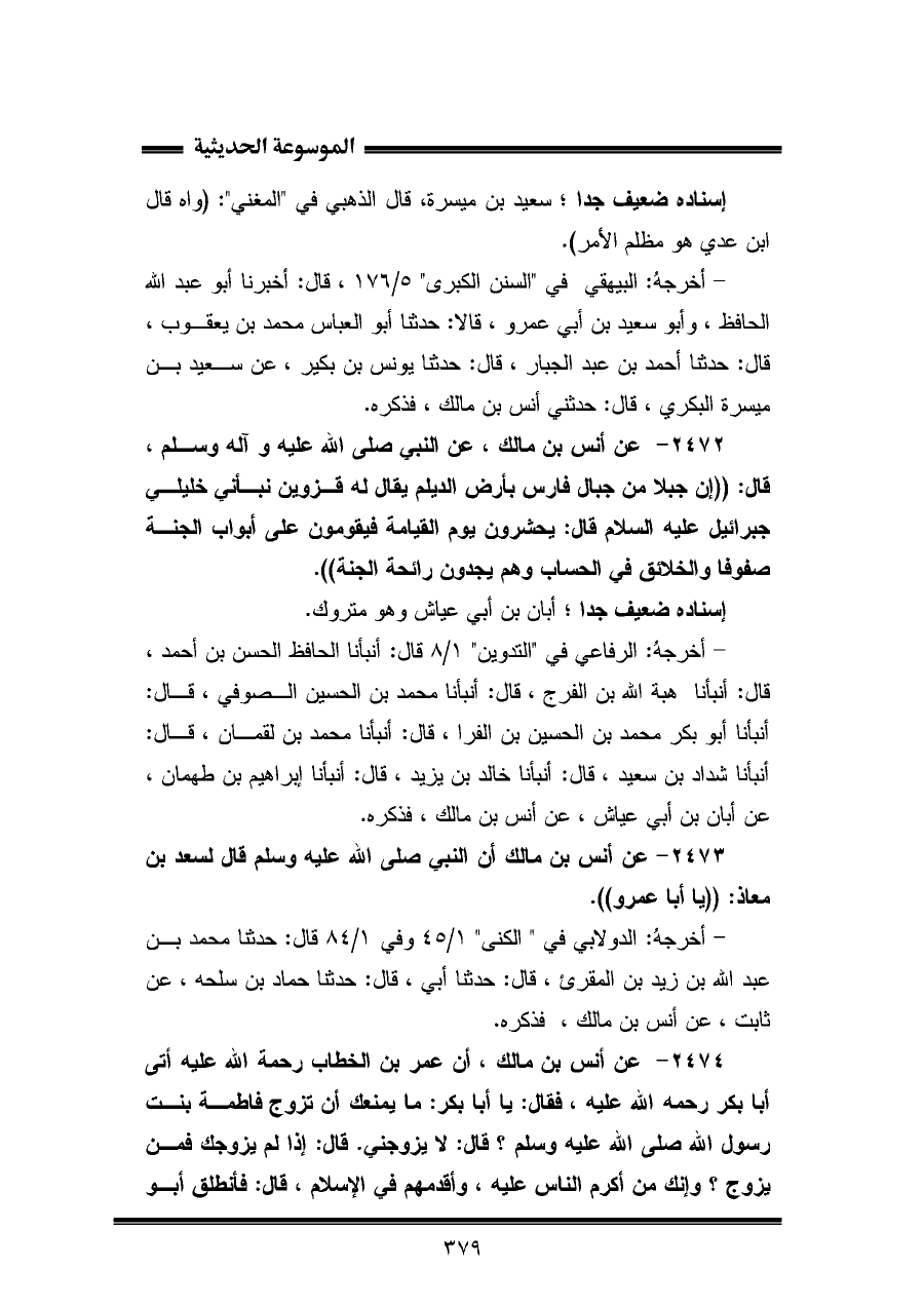 - أخرجهُ: البيهقي في "السنن الكبرى" ٥/ ١٧٦، قال: أخبرنا أبو عبد اللَّه الحافظ، وأبو سعيد بن أبي عمرو، قالا: حدثنا أبو العباس محمد بن يعقوب، قال: حدثنا أحمد بن عبد الجبار، قال: حدثنا يونس بن بكير، عن سعيد بن ميسرة البكري، قال: حدثني أنس بن مالك، فذكره.