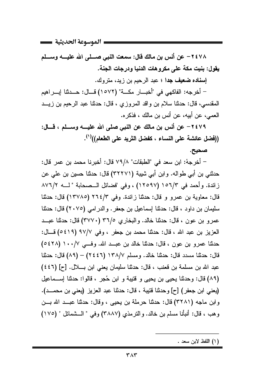٢٤٧٩ - عن أنس بن مالك عن النبي صلى اللَّه عليه وسلم، قال: "فضل عائشة على النساء، كفضل الثريد على الطعام" (¬١).