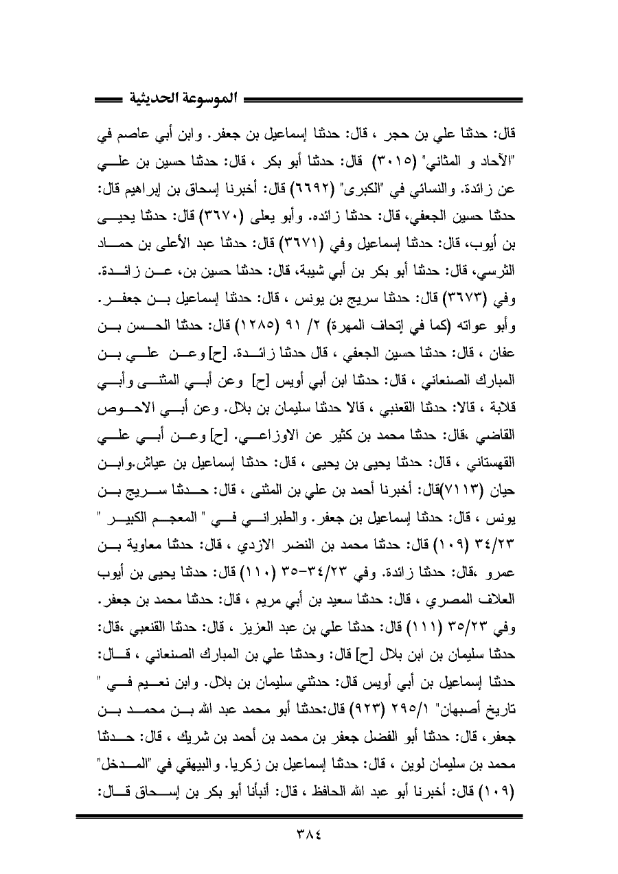 قال: حدثنا علي بن حجر، قال: حدثنا إسماعيل بن جعفر. وابن أبي عاصم في "الآحاد والمثاني" (٣٠١٥) قال: حدثنا أبو بكر، قال: حدثنا حسين بن علي عن زائدة. والنسائي في "الكبرى" (٦٦٩٢) قال: أخبرنا إسحاق بن إبراهيم قال: حدثنا حسين الجعفي، قال: حدثنا زائده. وأبو يعلى (٣٦٧٠) قال: حدثنا يحيى بن أيوب، قال: حدثنا إسماعيل وفي (٣٦٧١) قال: حدثنا عبد الأعلى بن حماد الثرسي، قال: حدثنا أبو بكر بن أبي شيبة، قال: حدثنا حسين بن، عن زائدة. وفي (٣٦٧٣) قال: حدثنا سريج بن يونس، قال: حدثنا إسماعيل بن جعفر. وأبو عوانة (كما في إتحاف المهرة) ٢/ ٩١ (١٢٨٥) قال: حدثنا الحسن بن عفان، قال: حدثنا حسين الجعفي، قال حدثنا زائدة. [ح] وعن علي بن المبارك الصنعاني، قال: حدثنا ابن أبي أويس [ح] وعن أبي المثنى وأبي قلابة، قالا: حدثنا القعنبي، قالا حدثنا سليمان بن بلال. وعن أبي الأحوص القاضي، قال: حدثنا محمد بن كثير عن الأوزاعي. [ح] وعن أبي علي القهستاني، قال: حدثنا يحيى بن يحيى، قال: حدثنا إسماعيل بن عياش. وابن حيان (٧١١٣) قال: أخبرنا أحمد بن علي بن المثنى، قال: حدثنا سريج بن يونس، قال: حدثنا إسماعيل بن جعفر. والطبراني في "المعجم الكبير" ٢٣/ ٣٤ (١٠٩) قال: حدثنا محمد بن النضر الازدي، قال: حدثنا معاوية بن عمرو، قال: حدثنا زائدة. وفي ٢٣/ ٣٤ - ٣٥ (١١٠) قال: حدثنا يحيى بن أيوب العلاف المصري، قال: حدثنا سعيد بن أبي مريم، قال: حدثنا محمد بن جعفر. وفي ٢٣/ ٣٥ (١١١) قال: حدثنا علي بن عبد العزيز، قال: حدثنا القنعبي، قال: حدثنا سليمان بن ابن بلال [ح] قال: وحدثنا علي بن المبارك الصنعاني، قال: حدثنا إسماعيل بن أبي أويس قال: حدثني سليمان بن بلال. وابن نعيم في "تاريخ أصبهان" ١/ ٢٩٥ (٩٢٣) قال: حدثنا أبو محمد عبد اللَّه بن محمد بن جعفر، قال: حدثنا أبو الفضل جعفر بن محمد بن أحمد بن شريك، قال: حدثنا محمد بن سليمان لوين، قال: حدثنا إسماعيل بن زكريا. والبيهقي في "المدخل" (١٠٩) قال: أخبرنا أبو عبد اللَّه الحافظ، قال: أنبأنا أبو بكر بن إسحاق قال: