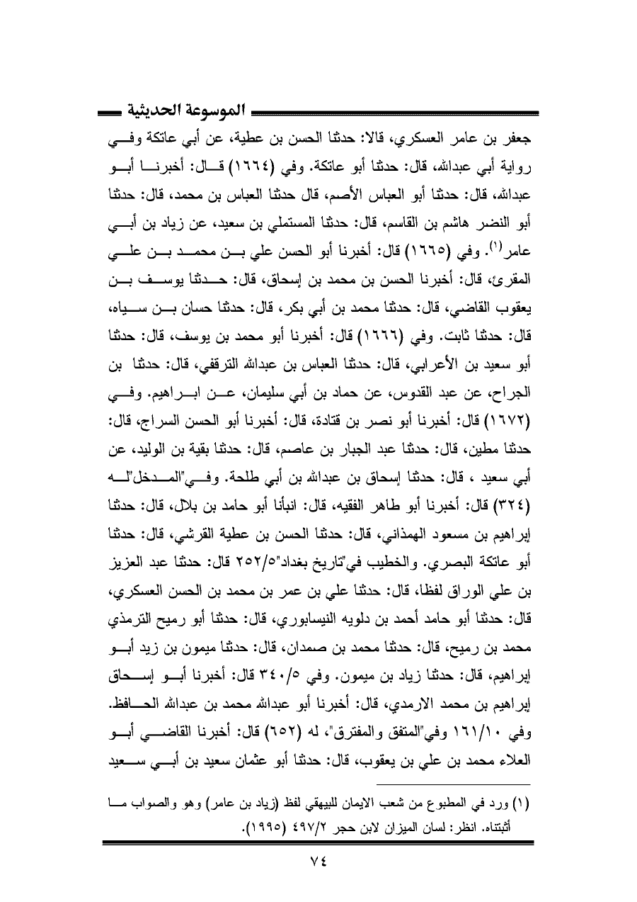جعفر بن عامر العسكري، قالا: حدثنا الحسن بن عطية، عن أبي عاتكة وفي رواية أبي عبد الله، قال: حدثنا أبو عاتكة. وفي (١٦٦٤) قال: أخبرنا أبو عبد الله، قال: حدثنا أبو العباس الأصم، قال حدثنا العباس بن محمد، قال: حدثنا أبو النضر هاشم بن القاسم، قال: حدثنا المستملي بن سعيد، عن زياد بن أبي عامر (¬١). وفي (١٦٦٥) قال: أخبرنا أبو الحسن علي بن محمد بن علي المقرئ، قال: أخبرنا الحسن بن محمد بن إسحاق، قال: حدثنا يوسف بن يعقوب القاضي، قال: حدثنا محمد بن أبي بكر، قال: حدثنا حسان بن سياه، قال: حدثنا ثابت. وفي (١٦٦٦) قال: أخبرنا أبو محمد بن يوسف، قال: حدثنا أبو سعيد بن الأعرابي، قال: حدثنا العباس بن عبد الله الترقفي، قال: حدثنا بن الجراح، عن عبد القدوس، عن حماد بن أبي سليمان، عن إبراهيم. وفي (١٦٧٢) قال: أخبرنا أبو نصر بن قتادة، قال: أخبرنا أبو الحسن السراج، قال: حدثنا مطين، قال: حدثنا عبد الجبار بن عاصم، قال: حدثنا بقية بن الوليد، عن أبي سعيد، قال: حدثنا إسحاق بن عبد الله بن أبي طلحة. وفي "المدخل" له (٣٢٤) قال: أخبرنا أبو طاهر الفقيه، قال: انبأنا أبو حامد بن بلال، قال: حدثنا إبراهيم بن مسعود الهمذاني، قال: حدثنا الحسن بن عطية القرشي، قال: حدثنا أبو عاتكة البصري. والخطيب في "تاريخ بغداد" ٥/ ٢٥٢ قال: حدثنا عبد العزيز بن علي الوراق لفظا، قال: حدثنا علي بن عمر بن محمد بن الحسن العسكري، قال: حدثنا أبو حامد أحمد بن دلويه النيسابوري، قال: حدثنا أبو رميح الترمذي محمد بن رميح، قال: حدثنا محمد بن صمدان، قال: حدثنا ميمون بن زيد أبو إبراهيم، قال: حدثنا زياد بن ميمون. وفي ٥/ ٣٤٠ قال: أخبرنا أبو إسحاق إبراهيم بن محمد الارمدي، قال: أخبرنا أبو عبد الله محمد بن عبد الله الحافظ. وفي ١٠/ ١٦١ وفي "المتفق والمفترق"، له (٦٥٢) قال: أخبرنا القاضي أبو العلاء محمد بن علي بن يعقوب، قال: حدثنا أبو عثمان سعيد بن أبي سعيد