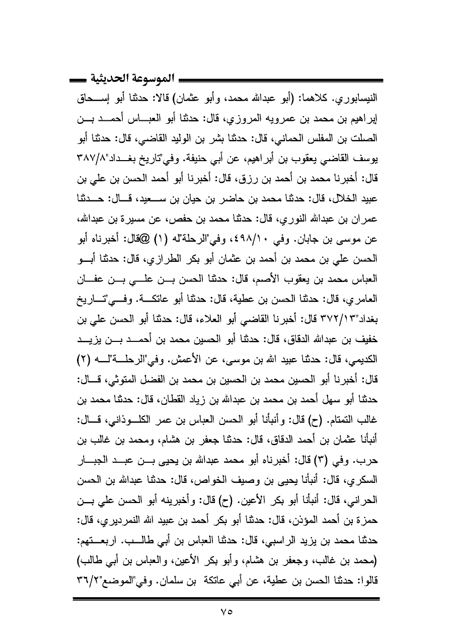 النيسابوري. كلاهما: (أبو عبد الله محمد، وأبو عثمان) قالا: حدثنا أبو إسحاق إبراهيم بن محمد بن عمرويه المروزي، قال: حدثنا أبو العباس أحمد بن الصلت بن المفلس الحماني، قال: حدثنا بشر بن الوليد القاضي، قال: حدثنا أبو يوسف القاضي يعقوب بن إبراهيم، عن أبي حنيفة. وفي "تاريخ بغداد" ٨/ ٣٨٧ قال: أخبرنا محمد بن أحمد بن رزق، قال: أخبرنا أبو أحمد الحسن بن علي بن عبيد الخلال، قال: حدثنا محمد بن حاضر بن حيان بن سعيد، قال: حدثنا عمران بن عبد الله النوري، قال: حدثنا محمد بن حفص، عن مسيرة بن عبد الله، عن موسى بن جابان. وفي ١٠/ ٤٩٨، وفي "الرحلة" له (١) قال: أخبرناه أبو الحسن علي بن محمد بن أحمد بن عثمان أبو بكر الطرازي، قال: حدثنا أبو العباس محمد بن يعقوب الأصم، قال: حدثنا الحسن بن علي بن عفان العامري، قال: حدثنا الحسن بن عطية، قال: حدثنا أبو عاتكة. وفي "تاريخ بغداد" ١٣/ ٣٧٢ قال: أخبرنا القاضي أبو العلاء، قال: حدثنا أبو الحسن علي بن خفيف بن عبد الله الدقاق، قال: حدثنا أبو الحسين محمد بن أحمد بن يزيد الكديمي، قال: حدثنا عبيد الله بن موسى، عن الأعمش. وفي "الرحلة" له (٢) قال: أخبرنا أبو الحسين محمد بن الحسين بن محمد بن الفضل المتوثي، قال: حدثنا أبو سهل أحمد بن محمد بن عبد الله بن زياد القطان، قال: حدثنا محمد بن غالب التمتام. (ح) قال: وأنبأنا أبو الحسن العباس بن عمر الكلوذاني، قال: أنبأنا عثمان بن أحمد الدقاق، قال: حدثنا جعفر بن هشام، ومحمد بن غالب بن حرب. وفي (٣) قال: أخبرناه أبو محمد عبد الله بن يحيى بن عبد الجبار السكري، قال: أنبأنا يحيى بن وصيف الخواص، قال: حدثنا عبد الله بن الحسن الحراني، قال: أنبأنا أبو بكر الأعين. (ح) قال: وأخبرينه أبو الحسن علي بن حمزة بن أحمد المؤذن، قال: حدثنا أبو بكر أحمد بن عبيد الله النمرديري، قال: حدثنا محمد بن يزيد الراسبي، قال: حدثنا العباس بن أبي طالب. أربعتهم: (محمد بن غالب، وجعفر بن هشام، وأبو بكر الأعين، والعباس بن أبي طالب) قالوا: حدثنا الحسن بن عطية، عن أبي عاتكة بن سلمان. وفي "الموضع" ٢/ ٣٦