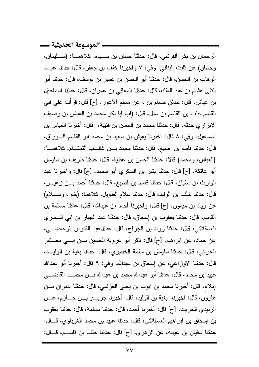 الرحمان بن بكر القرشي، قال: حدثنا حسان بن سياه. كلاهما: (سليمان، وحسان) عن ثابت البنائي. وفي: ٧ وأخبرنا خلف بن جعفر، قال: حدثنا عبد الوهاب بن الحسن، قال: حدثنا أبو الحسن بن عمير بن يوسف، قال: حدثنا أبو التقى هشام بن عبد الملك، قال: حدثنا المعافي بن عمران، قال: حدثنا إسماعيل بن عياش، قال: حدثنا حسام بن، عن مسلم الاعور. [ح] قال: قرأت على أبي القاسم خلف بن القاسم بن سنل، قال: أن أبا بكر محمد بن العباس بن وصيف الابزاري حدثه، قال: حدثنا محمد بن الحسن بن قتيبة، قال: أخبرنا العباس بن إسماعيل. وفي: ٨ قال: أخبرنا يعيش بن سعيد بن محمد أبو القاسم الوراق، قال: حدثنا قاسم بن اصبغ، قال: حدثنا محمد بن غالب التمتام. كلاهما: (العباس، ومحمد) قالا: حدثنا الحسن بن عطية، قال: حدثنا طريف بن سليمان أبو عاتكة. [ح] قال: حدثنا بشر بن السكري أبو محمد. [ح] قال: وأخبرنا عبد الوارث بن سفيان، قال: حدثنا قاسم بن اصبغ، قال: حدثنا أحمد بن زهير، قال: حدثنا خلف بن الوليد، قال: حدثنا سلام الطويل. كلاهما: (بشر، وسلام) عن زياد بن ميمون. [ح] قال: وأخبرنا أحمد بن عبد الله، قال: حدثنا مسلمة بن القاسم، قال: حدثنا يعقوب بن إسحاق، قال: حدثنا عبد الجبار بن أبي السري العسقلاني، قال: حدثنا رواد بن الجراح، قال: حدثنا عبد القدوس الوحاضي، عن حماد، عن إبراهيم. [ح] قال: ذكر أبو عروبة الحسين بن أبي معشر الحراني، قال: حدثنا سليمان بن سلمة الخبابري، قال: حدثنا بغية بن الوليد، قال: حدثنا الأوزاعي، عن إسحاق بن عبد الله. وفي: ٩ قال: أخبرنا أبو عبد الله عبيد بن محمد، قال: حدثنا أبو عبد الله محمد بن عبد الله بن محمد القاضي إملاءٍ، قال: أخبرنا محمد بن أيوب بن يحيى الغزلمي، قال: حدثنا عمران بن هارون، قال: أخبرنا بغية بن الوليد، قال: أخبرنا جرير بن حازم، عن الزبيدي الخريت. [ح] قال: أخبرنا أحمد، قال: حدثنا مسلمة، قال: حدثنا يعقوب بن إسحاق بن إبراهيم العسقلاني، قال: حدثنا عبيد بن محمد الغرباوي، قال: حدثنا سفيان بن عيينه، عن الزهري. [ح] قال: حدثنا خلف بن قاسم، قال: