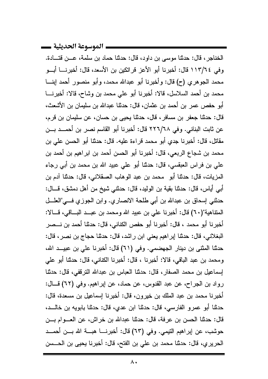 الخناجر، قال: حدثنا موسى بن داود، قال: حدثنا حماد بن سلمة، عن قتادة. وفي ٦٤/ ١١٣ قال: أخبرنا أبو الأعز قراتكين بن الأسعد، قال: أخبرنا أبو محمد الجوهري (ح) قال: وأخبرنا أبو عبد الله محمد، وأبو منصور أحمد إبنا محمد بن أحمد السلاسل، قالا: أخبرنا أبو علي محمد بن وشاح، قالا: أخبرنا أبو حفص عمر بن أحمد بن عثمان، قال: حدثنا عبد الله بن سليمان بن الأشعث، قال: حدثنا جعفر بن مسافر، قال، حدثنا يحيى بن حسان، عن سليمان بن قرم، عن ثابت البناني. وفي ٦٨/ ٢٢٦ قال: أخبرنا أبو القاسم نصر بن أحمد بن مقاتل، قال: أخبرنا جدي أبو محمد قراءة عليه. قال: حدثنا أبو الحسن علي بن محمد بن شجاع الربعي، قال: أخبرنا أبو الحسن أحمد بن إبراهيم بن أحمد بن علي بن فراس العبقسي، قال: حدثنا أبو علي عبيد الله بن محمد بن أبي رجاء المزيات، قال: حدثنا أبو محمد بن عبد الوهاب العسقلاني، قال: حدثنا آدم بن أبي أياس، قال: حدثنا بقية بن الوليد، قال: حدثني شيخ من أهل دمشق، قال: حدثني إسحاق بن عبد الله بن أبي طلحة الأنصاري. وابن الجوزي في "العلل المتناهية" (٦٠) قال: أخبرنا علي بن عبيد الله ومحمد بن عبد الباقي، قالا: أخبرنا أبو محمد، قال: أخبرنا أبو حفص الكناني، قال: حدثنا أحمد بن نصر البغلاني، قال: حدثنا إبراهيم يعني ابن راشد، قال: حدثنا حجاج بن نصر، قال: حدثنا المثنى بن دينار الجهضمي. وفي (٦١) قال: أخبرنا علي بن عبيد الله، ومحمد بن عبد الباقي، قالا: أخبرنا، قال: أخبرنا الكناني، قال: حدثنا أبو علي إسماعيل بن محمد الصفار، قال: حدثنا العباس بن عبد الله الترقفي، قال: حدثنا رواد بن الجراح، عن عبد القدوس، عن حماد، عن إبراهيم. وفي (٦٢) قال: أخبرنا محمد بن عبد الملك بن خيرون، قال: أخبرنا إسماعيل بن مسعدة، قال: حدثنا أبو عمرو الفارسي، قال: حدثنا ابن عدي، قال: حدثنا بابويه بن خالد، قال: حدثنا الحسن بن عرفة، قال: حدثنا عبد الله بن خراش، عن العوام بن حوشب، عن إبراهيم التيمي. وفي (٦٣) قال: أخبرنا هبة الله بن أحمد الحريري، قال: حدثنا محمد بن علي بن الفتح، قال: أخبرنا يحيى بن الحسن