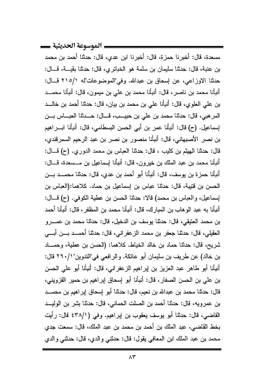 مسعدة، قال: أخبرنا حمزة، قال: أخبرنا ابن عدي، قال: حدثنا أحمد بن محمد بن عنبة، قال: حدثنا سليمان بن سلمة هو الخبائري، قال: حدثنا بقية، قال: حدثنا الأوزاعي، عن إسحاق بن عبد الله. وفي "الموضوعات" له ١/ ٢١٥ قال: أنبأنا محمد بن ناصر، قال: أنبأنا محمد بن علي بن ميمون، قال: أنبأنا محمد بن علي العلوي، قال: أنبأنا علي بن محمد بن بيان، قال: حدثنا أحمد بن خالد المرهبي، قال: حدثنا محمد بن علي بن حبيب، قال: حدثنا العباس بن إسماعيل. (ح) قال: أنبأنا عمر بن أبي الحسن البسطامي، قال: أنبأنا إبراهيم بن نصر الأصبهاني، قال: أنبأنا منصور بن نصر بن عبد الرحيم السمرقندي، قال: حدثنا الهيثم بن كليب، قال: حدثنا العباس بن محمد الدوري. (ح) قال: أنبأنا محمد بن عبد الملك بن خيرون، قال: أنبأنا إسماعيل بن مسعدة، قال: أنبأنا حمزة بن يوسف، قال: أنبأنا أبو أحمد بن عدي، قال: حدثنا محمد بن الحسن بن قتيبة، قال: حدثنا عباس بن إسماعيل بن حماد. كلاهما: (العباس بن إسماعيل، والعباس بن محمد) قالا: حدثنا الحسن بن عطية الكوفي. (ح) قال: أنبأنا به عبد الوهاب بن المبارك، قال: أنبأنا محمد بن المظفر، قال: أنبأنا أحمد بن محمد العتيقي، قال: حدثنا يوسف بن الدخيل، قال: حدثنا محمد بن عمرو العقيلي، قال: حدثنا جعفر بن محمد الزعفراني، قال: حدثنا أحمد بن أبي شريح، قال: حدثنا حماد بن خالد الخياط. كلاهما: (الحسن بن عطية، وحماد بن خالد) عن طريف بن سليمان أبو عاتكة. والرافعي في "التدوين" ١/ ٢٩٠ قال: أنبأنا أبو طاهر عبد العزيز بن إبراهيم الزعفراني، قال: أنبأنا أبو علي الحسن بن علي بن الحسن الصفار، قال: أنبأنا أبو إسحاق إبراهيم بن حمير القزويني، قال: حدثنا محمد بن عبد الله بن نعيم، قال: حدثنا أبو إسحاق إبراهيم بن محمد بن عمرويه، قال: حدثنا أحمد بن الصلت الحماني، قال: حدثنا بشر بن الوليد القاضي، قال: حدثنا أبو يوسف يعقوب بن إبراهيم. وفي (١/ ٤٣٨ قال: رأيت بخط القاضي، عبد الملك بن أحمد بن محمد بن عبد الملك، قال: سمعت جدي محمد بن عبد الملك ابن المعافي يقول: قال: حدثني والدي، قال: حدثني والدي