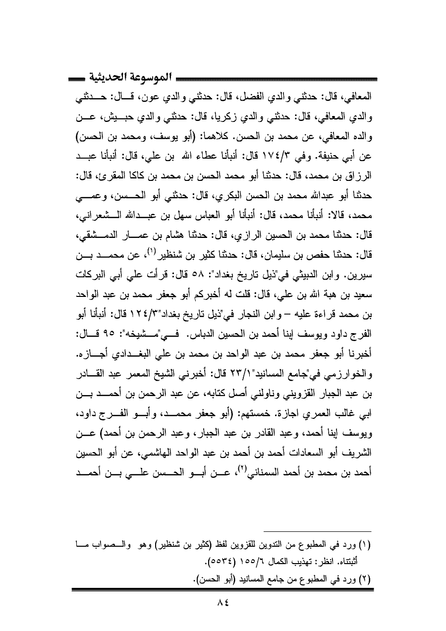 المعافي، قال: حدثني والدي الفضل، قال: حدثني والدي عون، قال: حدثني والدي المعافي، قال: حدثني والدي زكريا، قال: حدثني والدي حبيش، عن والده المعافي، عن محمد بن الحسن. كلاهما: (أبو يوسف، ومحمد بن الحسن) عن أبي حنيفة. وفي ٣/ ١٧٤ قال: أنبأنا عطاء الله بن علي، قال: أنبأنا عبد الرزاق بن محمد، قال: حدثنا أبو محمد الحسن بن محمد بن كاكا المقرئ، قال: حدثنا أبو عبد الله محمد بن الحسن البري، قال: حدثني أبو الحسن، وعمي محمد، قالا: أنبأنا محمد، قال: أنبأنا أبو العباس سهل بن عبد الله الشعراني، قال: حدثنا محمد بن الحسين الرازي، قال: حدثنا هشام بن عمار الدمشقي، قال: حدثنا حفص بن سليمان، قال: حدثنا كثير بن شنظير (¬١)، عن محمد بن سيرين. وابن الدبيثي في "ذيل تاريخ بغداد": ٥٨ قال: قرأت علي أبي البركات سعيد بن هبة الله بن علي، قال: قلت له أخبركم أبو جعفر محمد بن عبد الواحد بن محمد قراءة عليه - وابن النجار في "ذيل تاريخ بغداد" ٣/ ١٢٤ قال: أنبأنا أبو الفرج داود ويوسف إبنا أحمد بن الحسين الدباس. في "مشيخه": ٩٥ قال: أخبرنا أبو جعفر محمد بن عبد الواحد بن محمد بن علي البغدادي أجازه. والخوارزمي في "جامع المسانيد" ١/ ٢٣ قال: أخبرني الشيخ المعمر عبد القادر بن عبد الجبار القزويني وناولني أصل كتابه، عن عبد الرحمن بن أحمد بن أبي غالب العمري اجازة. خمستهم: (أبو جعفر محمد، وأبو الفرج داود، ويوسف إبنا أحمد، وعبد القادر بن عبد الجبار، وعبد الرحمن بن أحمد) عن الشريف أبو السعادات أحمد بن أحمد بن عبد الواحد الهاشمي، عن أبي الحسين أحمد بن محمد بن أحمد السمناني (¬٢)، عن أبي الحسن علي بن أحمد
