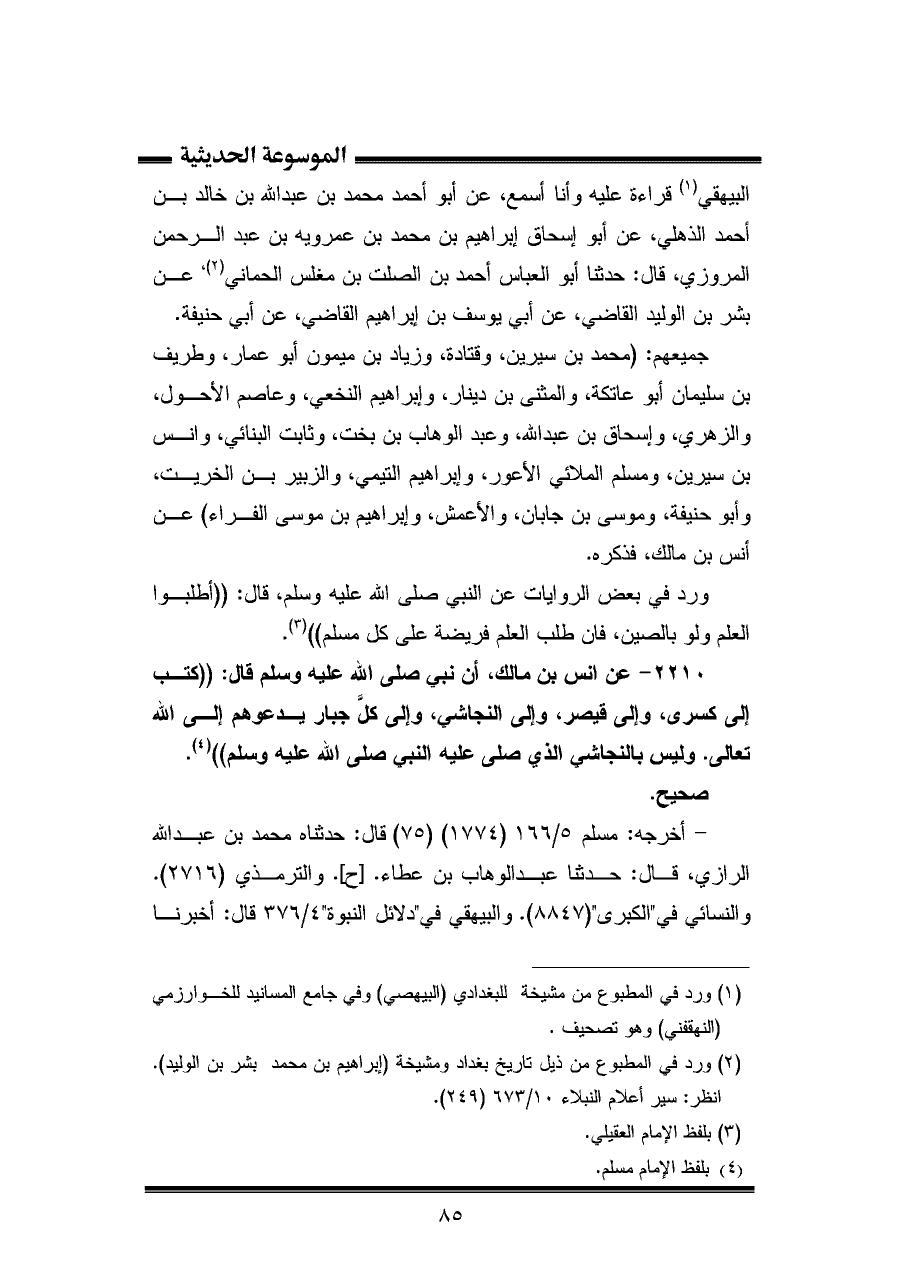 البيهقي (¬١) قراءة عليه وأنا أسمع، عن أبي أحمد محمد بن عبد الله بن خالد بن أحمد الذهلي، عن أبي إسحاق إبراهيم بن محمد بن عمرويه بن عبد الرحمن المروزي، قال: حدثنا أبو العباس أحمد بن الصلت بن مغلس الحماني (¬٢)، عن بشر بن الوليد القاضي، عن أبي يوسف بن إبراهيم القاضي، عن أبي حنيفة.
