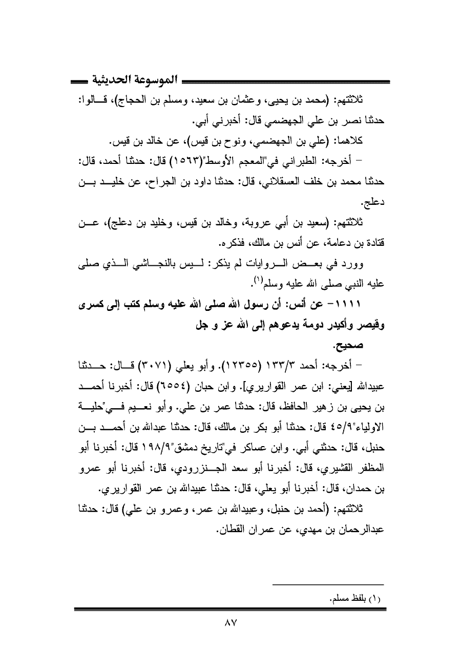 ١١١١ - عن أنس: أن رسول الله صلى الله عليه وسلم كتب إلى كسرى وقيصر وأكيدر دومة يدعوهم إلى الله عز وجل.