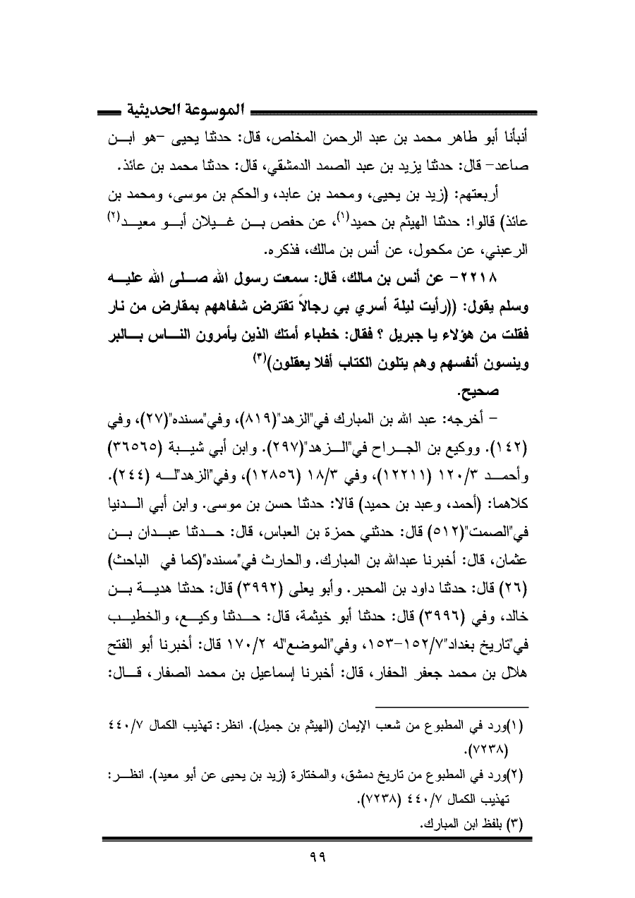 ٢٢١٨ - عن أنس بن مالك، قال: سمعت رسول الله صلى الله عليه وسلم يقول: "رأيت ليلة أسري بي رجالًا تقترض شفاههم بمقارض من نار فقلت من هؤلاء يا جبريل؟ فقال: خطباء أمتك الذين يأمرون الناس بالبر وينسون أنفسهم وهم يتلون الكتاب أفلا يعقلون) (¬٣)
